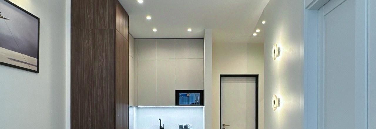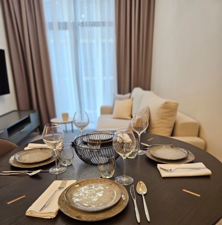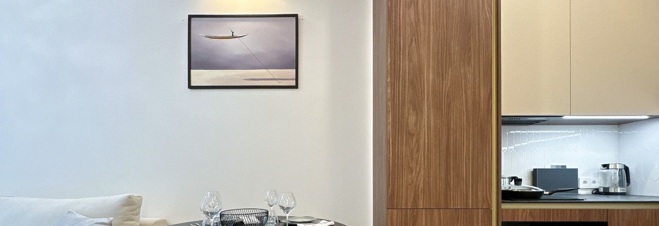 - кухонная зона оборудована необходимой бытовой техникой: варочная панель, духовая печь, свч, посудомоечная машина, вытяжка, сушилка для посуды. Мягкая подсветка кухни и необходимый инвентарь позволит сделать процесс кулинарного творчества более приятным. Обеденный стол сервирован на 4 персоны, что позволит принимать трапезы с гостями;