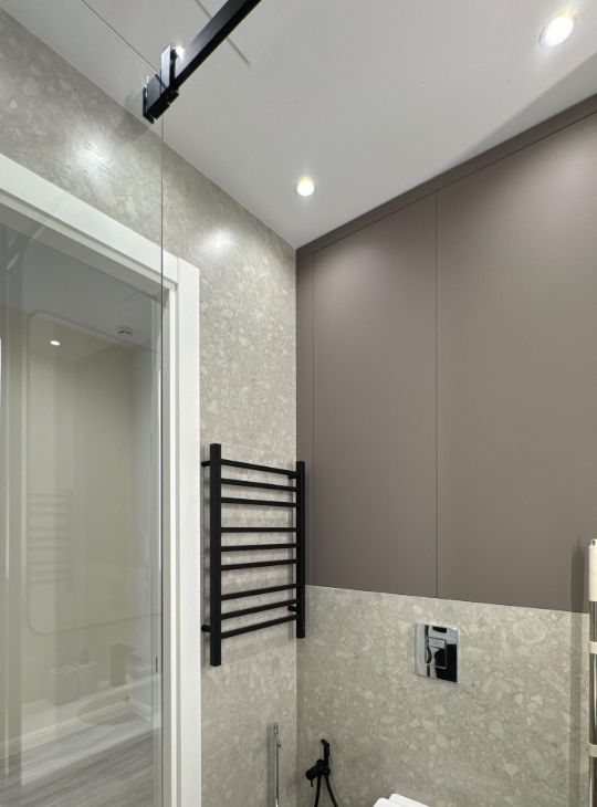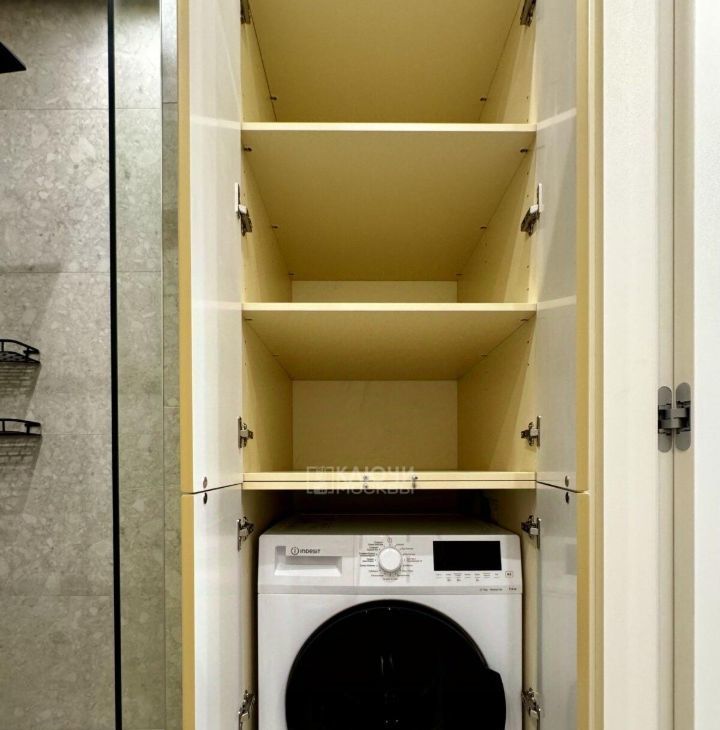 - санузел оснащен душевой кабиной с раздвижными дверцами, стирально-сушильной машиной, гардеробом для принадлежностей, зеркалом с подсветкой, гигиеническим душем;