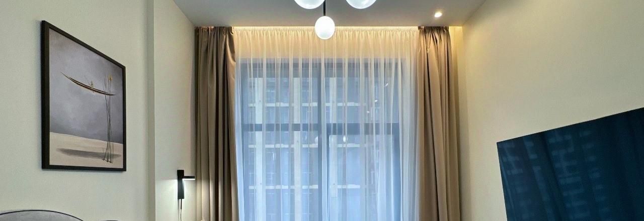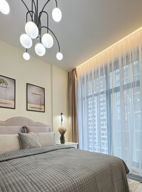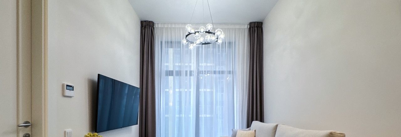 - гостиная зона оснащена раздвижным дизайнерским диваном, тв-тумбой и телевизором 55 дюймов. ПАНОРАМНЫЕ ОКНА с полноразмерными димаут портьерами и подсветкой придают мягкость и уют интерьеру;