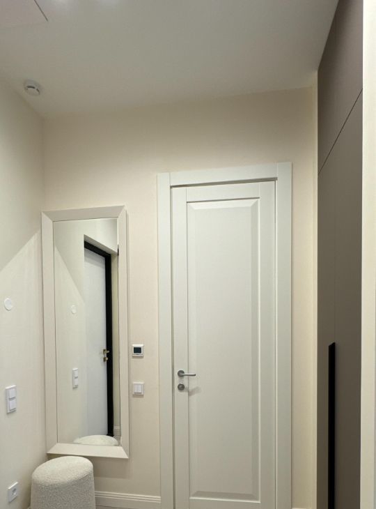 - прихожая зона имеет полноразмерное зеркало, пуфик, шкафчик для принадлежнойстей.