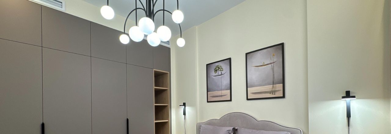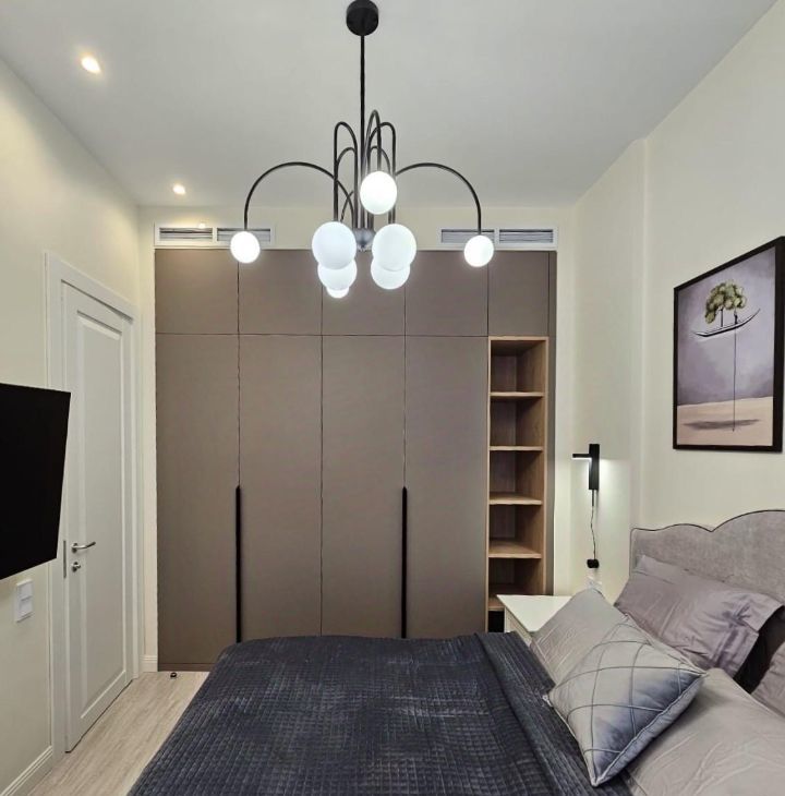 - спальня оборудована двуспальной кроватью, тв-тумбой с телевизором, гардеробом на всю стену. Димаут портьеры прикрывающие панорамные окна сделают Ваш отдых полноценным;