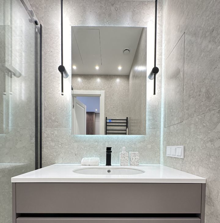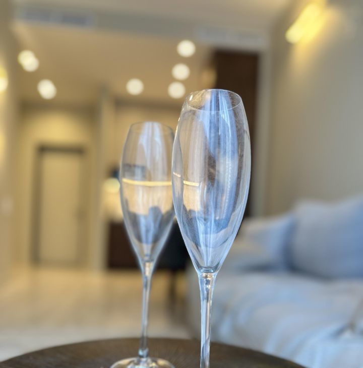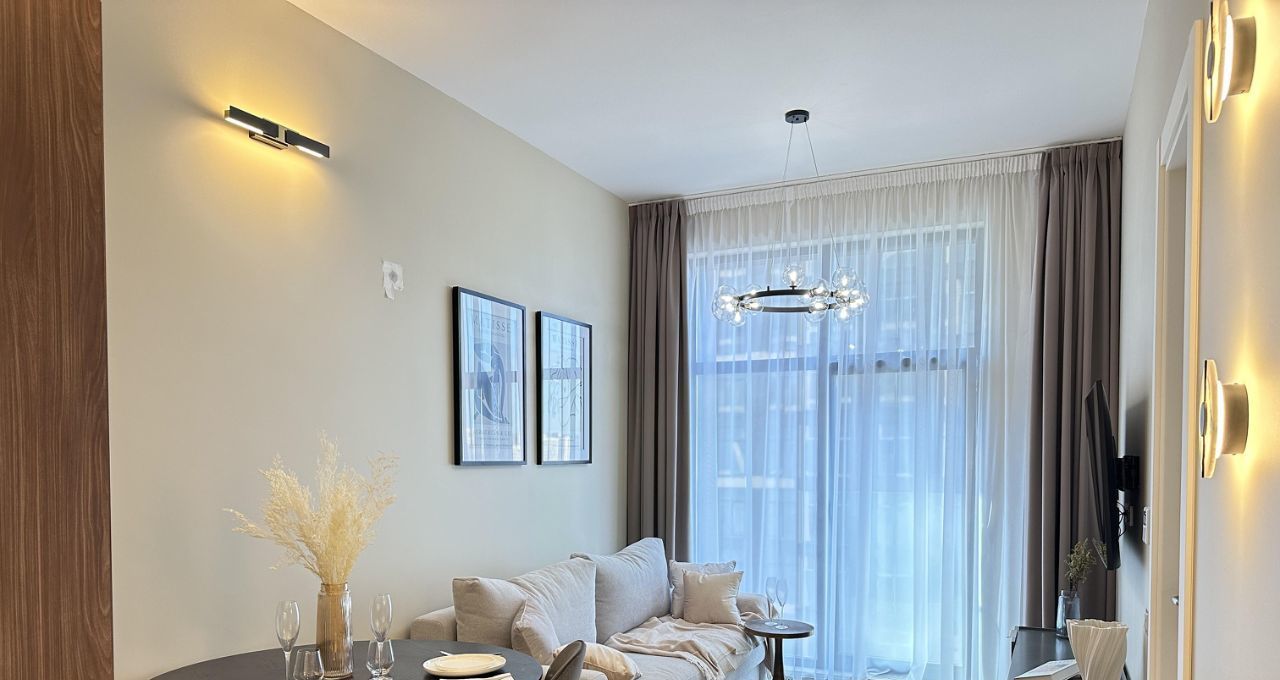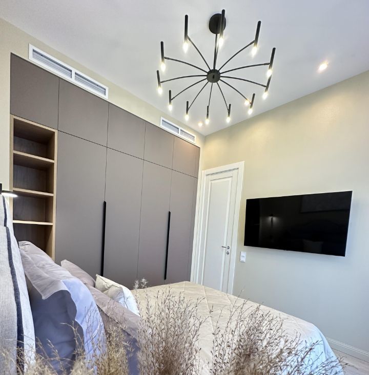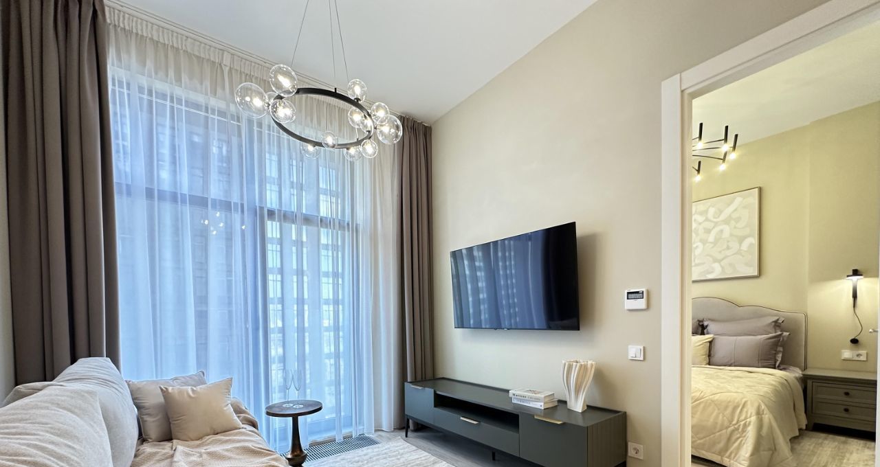 - гостиная зона оснащена раздвижным дизайнерским диваном, тв-тумбой и телевизором 55 дюймов. ПАНОРАМНЫЕ ОКНА с полноразмерными димаут портьерами и подсветкой придают мягкость и уют интерьеру;
