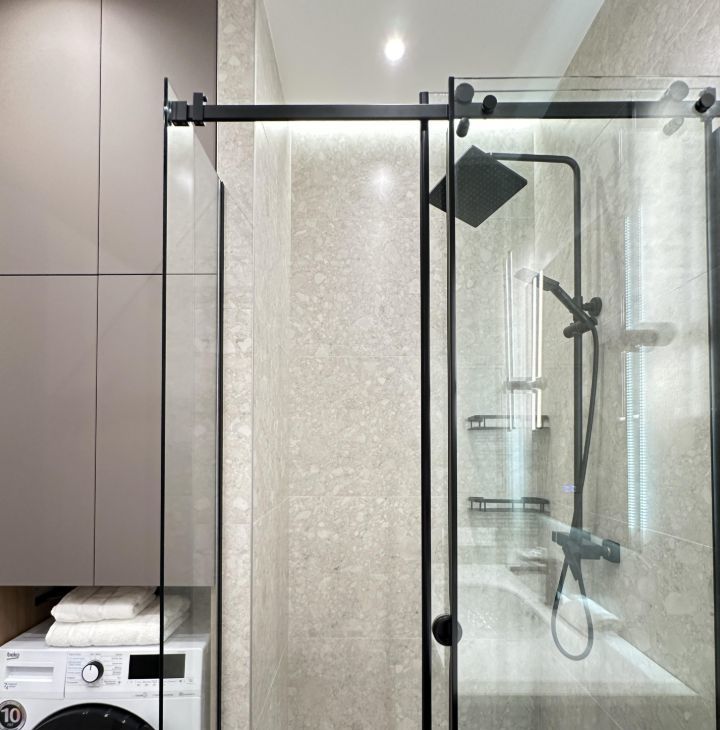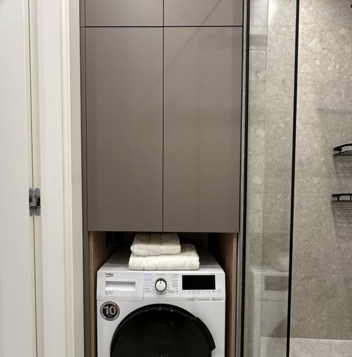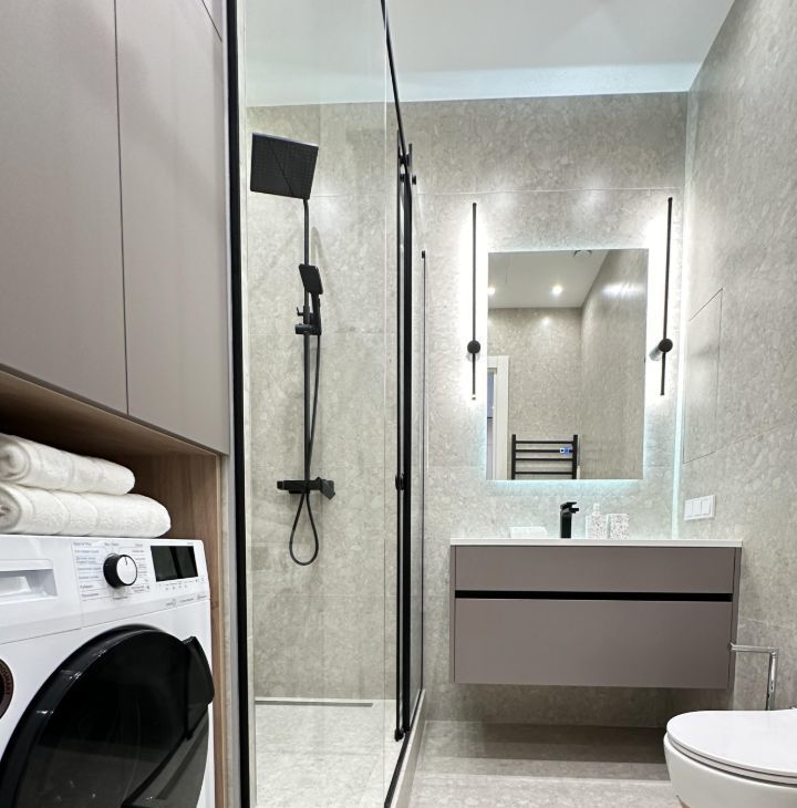 - санузел оснащен душевой кабиной с раздвижными дверцами, стирально-сушильной машиной, гардеробом для принадлежностей, зеркалом с подсветкой, гигиеническим душем.