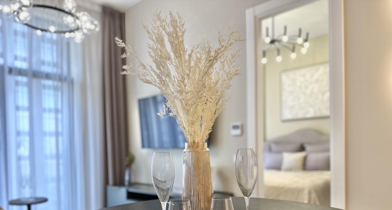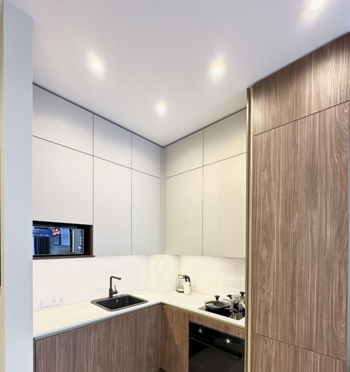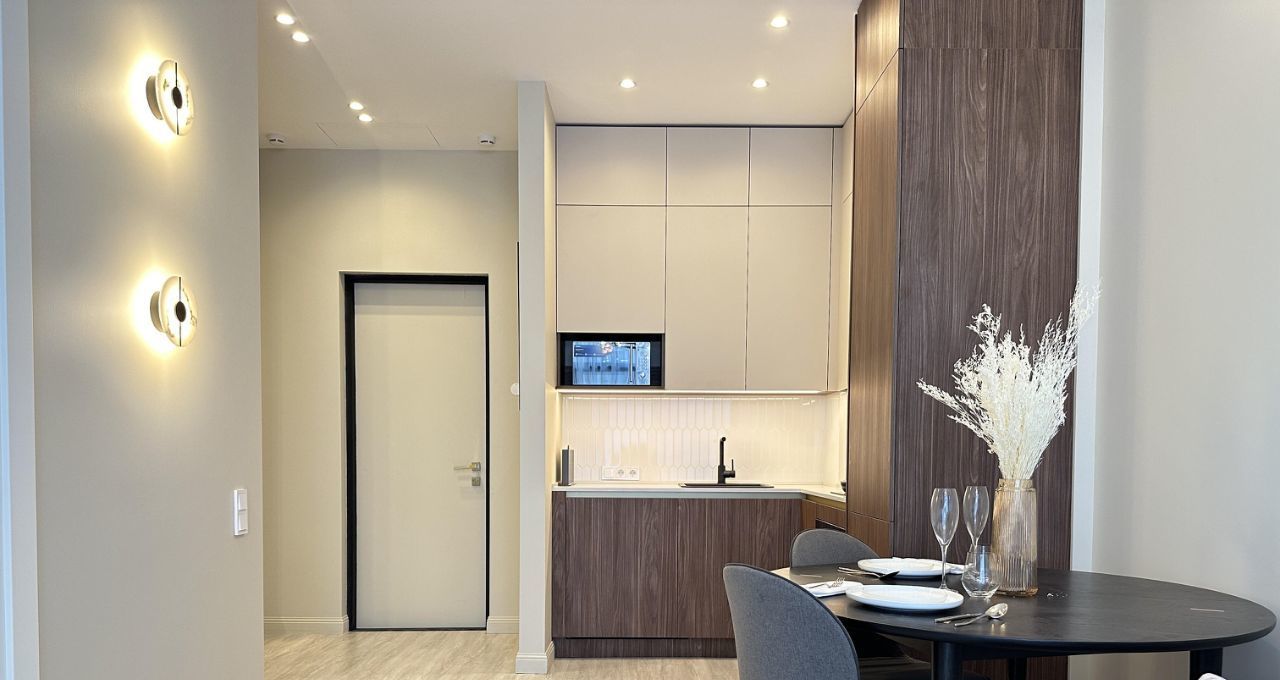 - кухонная зона оборудована необходимой бытовой техникой: варочная панель, духовая печь, свч, посудомоечная машина, вытяжка, сушилка для посуды. Мягкая подсветка кухни и необходимый инвентарь позволит сделать процесс кулинарного творчества более приятным. Обеденный стол сервирован на 4 персоны, что позволит принимать трапезы с гостями;