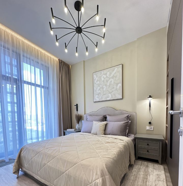 - спальня оборудована двуспальной кроватью, с телевизором, гардеробной. Димаут портьеры прикрывающие ПАНОРАМНЫЕ окна сделают Ваш отдых полноценным.