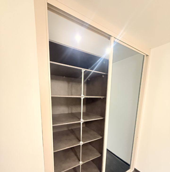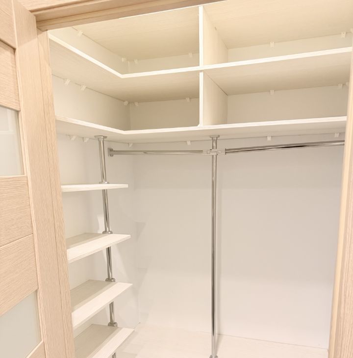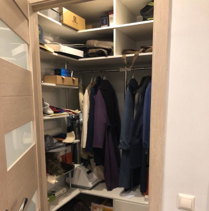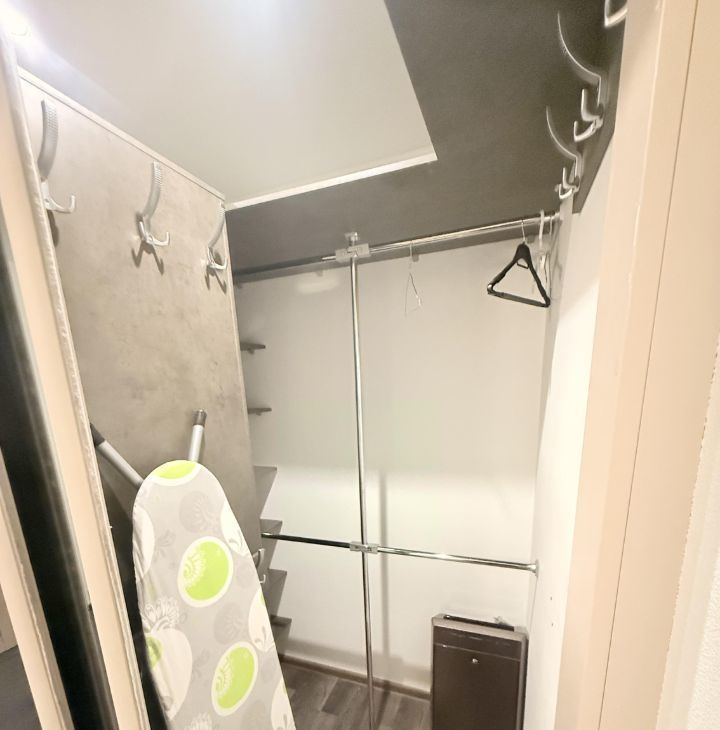 В квартире много мест для хранения: два гардероба (при входе и в спальне), комод, кровать с подъёмным механизмом, а также балкон.