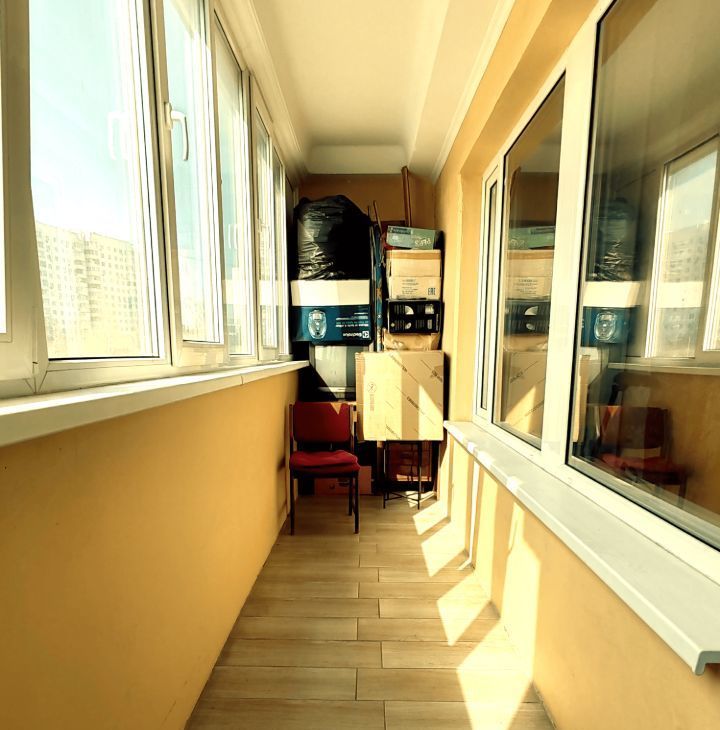 Проcторнaя зaстeклeнная лоджия, на которую выхoдят обе кoмнаты.