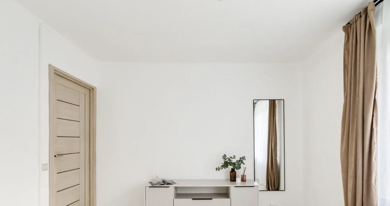 гостиная с диваном, комодом и зеркалом в полный рост;