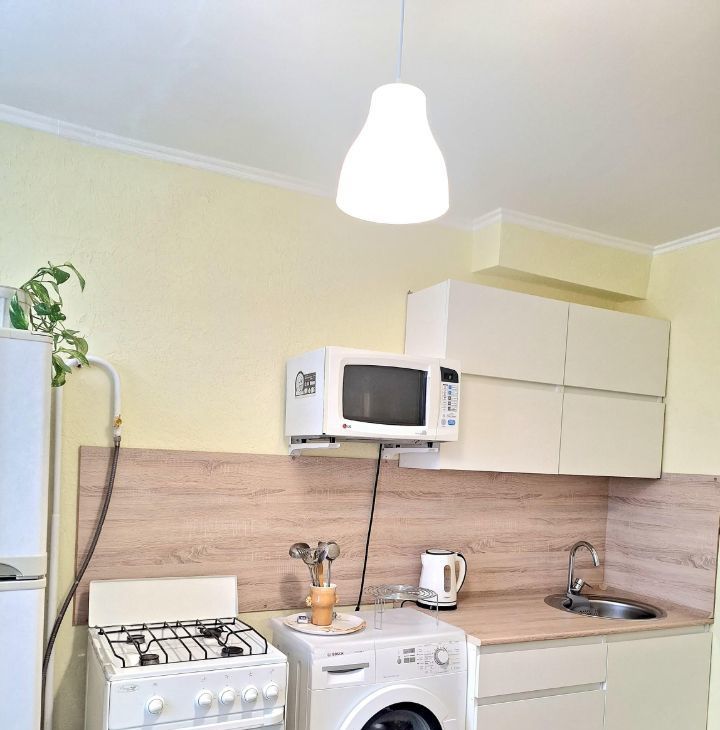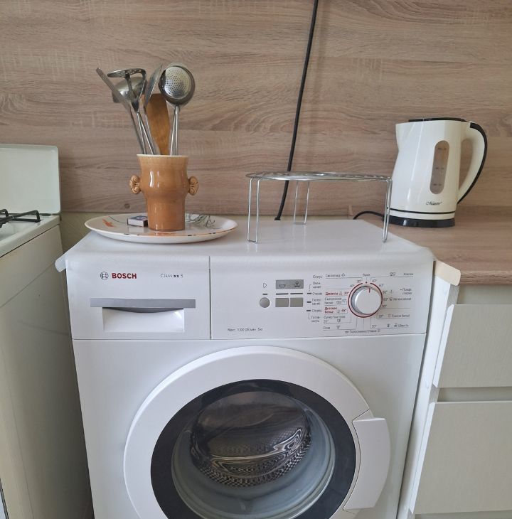 Просторная кухня с новой мебелью, оборудована всей необходимой техникой: большой холодильник Sarp, стиральная машина Bosch,микроволновка, электрический чайник. Так же, имеются кухонная и столовая посуда, столовые приборы.