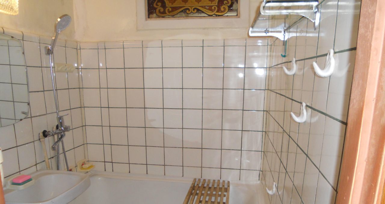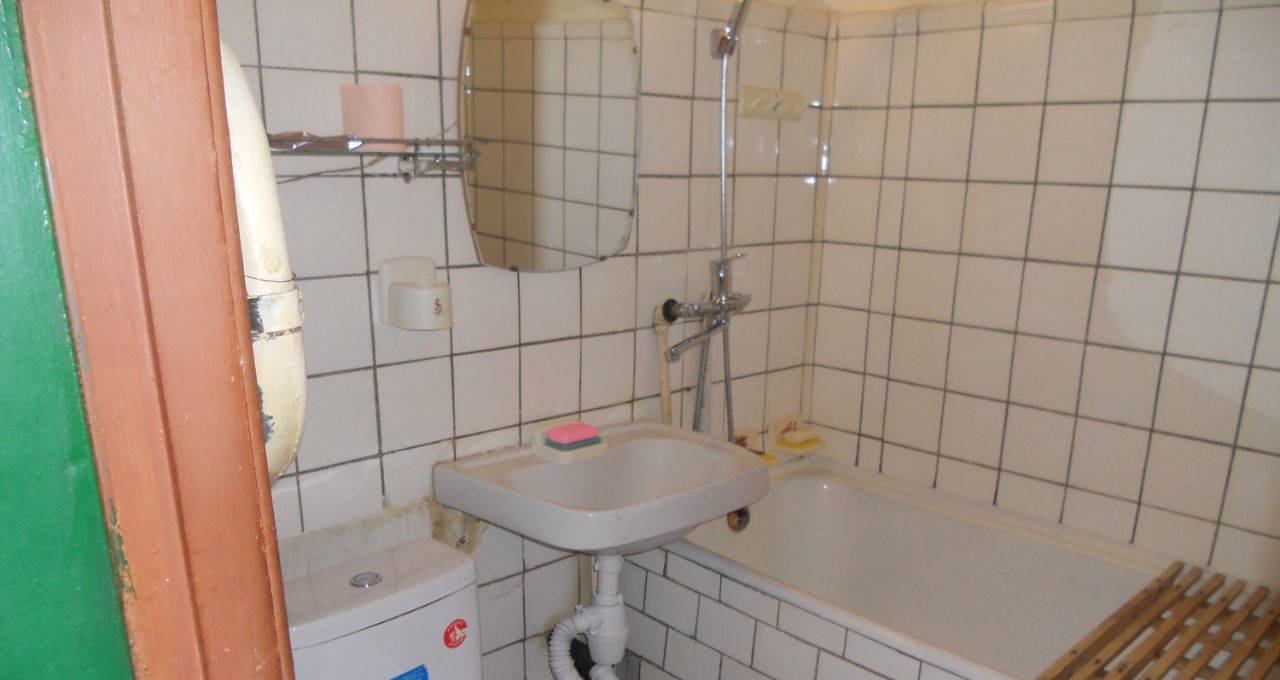 Санузел совмещенный: площадь 2.9 кв.м, пол плитка, стены плитка до потолка, ванная, унитаз, стиральная машина полуавтомат, зеркало, сантехника, сушилка для белья.