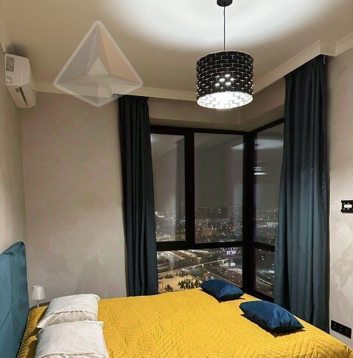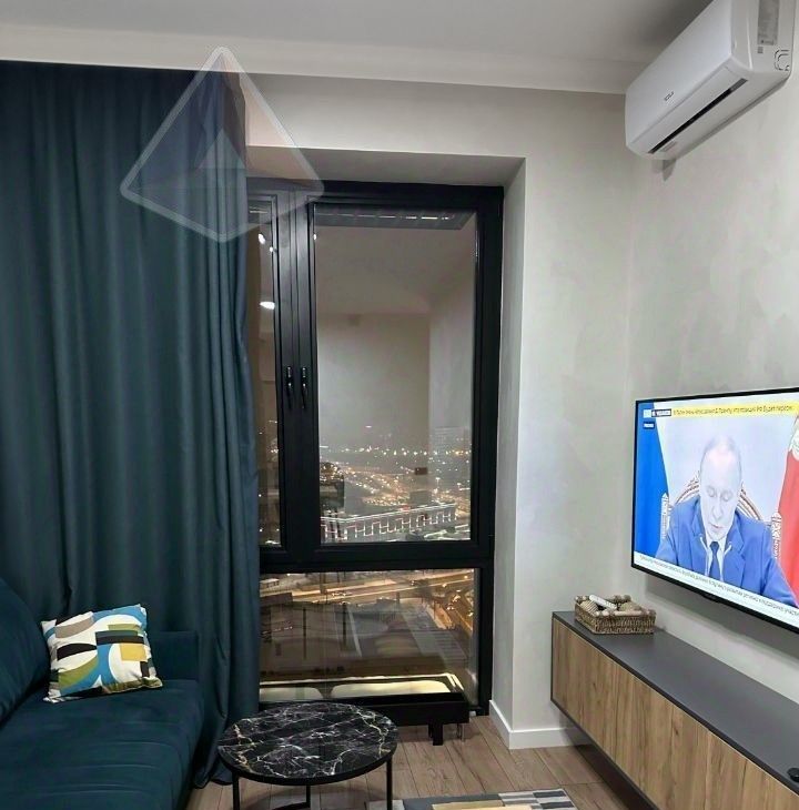 На 26 этаже башни бизнес-класса, где город превращается в сияющую панораму, ждёт очень чистая и уютная 2-комнатная квартира 40 м². Идеальный выбор для семейной пары без животных — изолированная спальня и огромная кухня-гостиная 20 м² с раскладным диваном, высокие потолки 3 м, вид с высоты, создающий ощущение полёта над мегаполисом.
