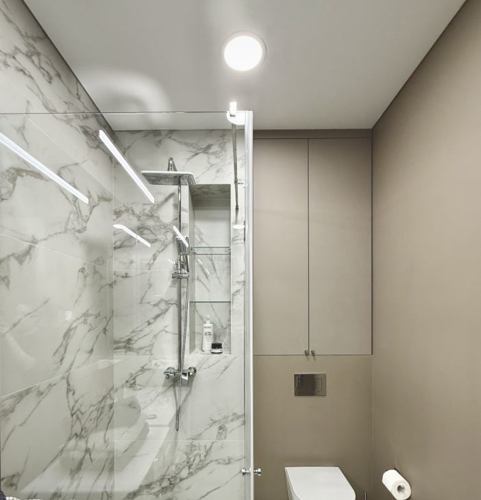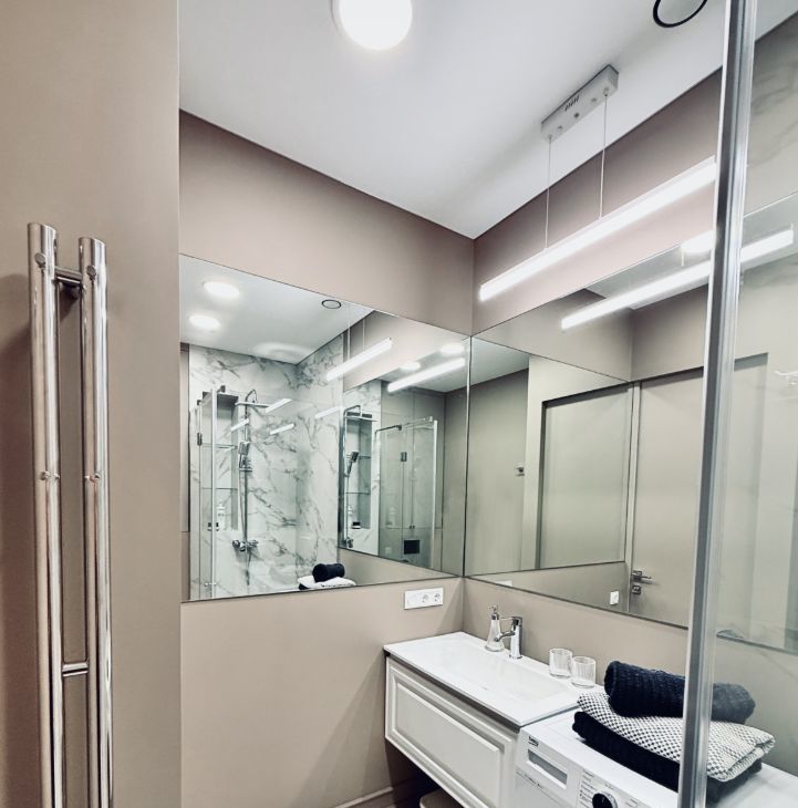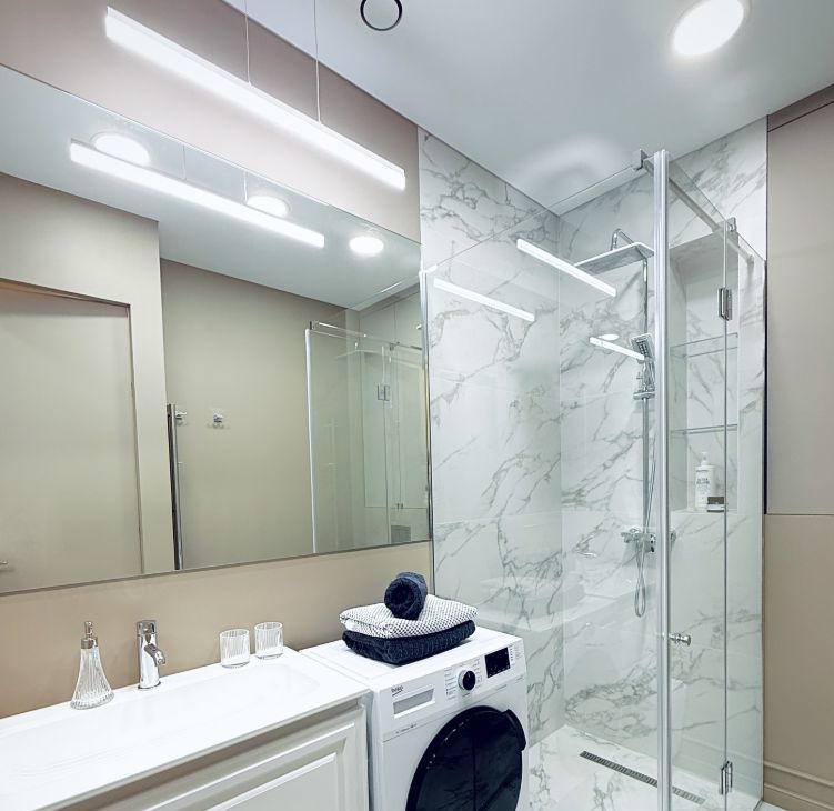 - Санузел с большой душевой, удобной раковиной и современной сантехникой.