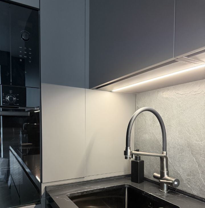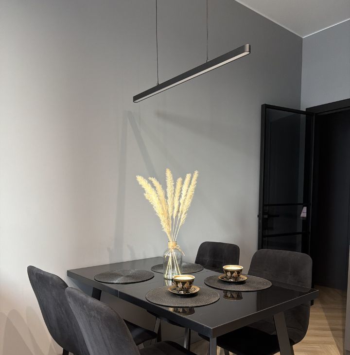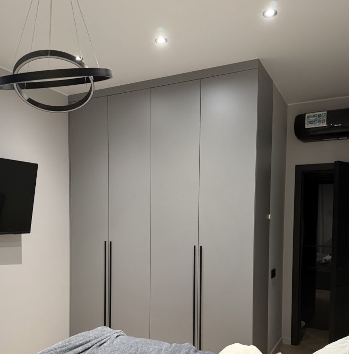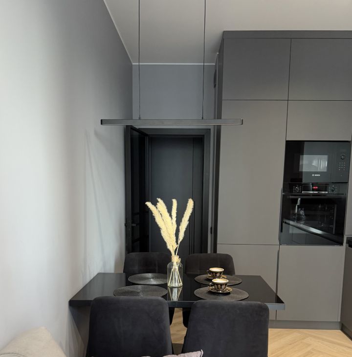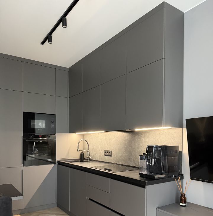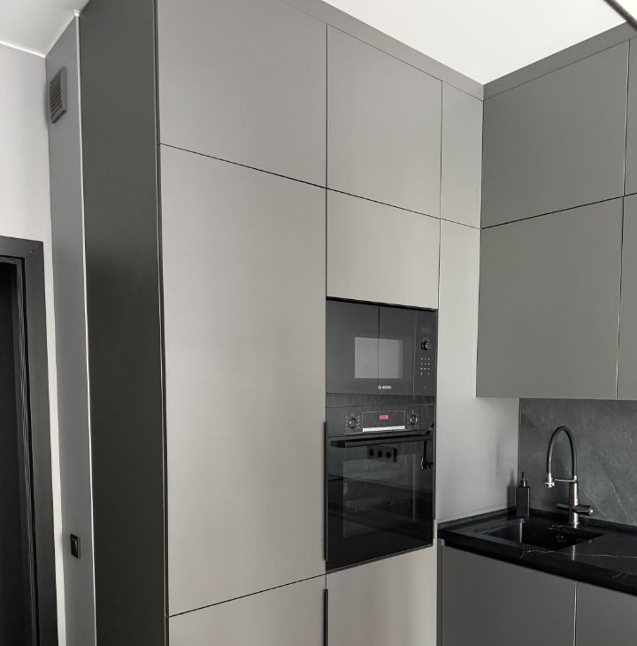 Большое количество мест хранения благодаря встроенным шкафам, стеклянные двери, вместительная кухня со всей необходимой европейской техникой и столешницей из декоративного камня.