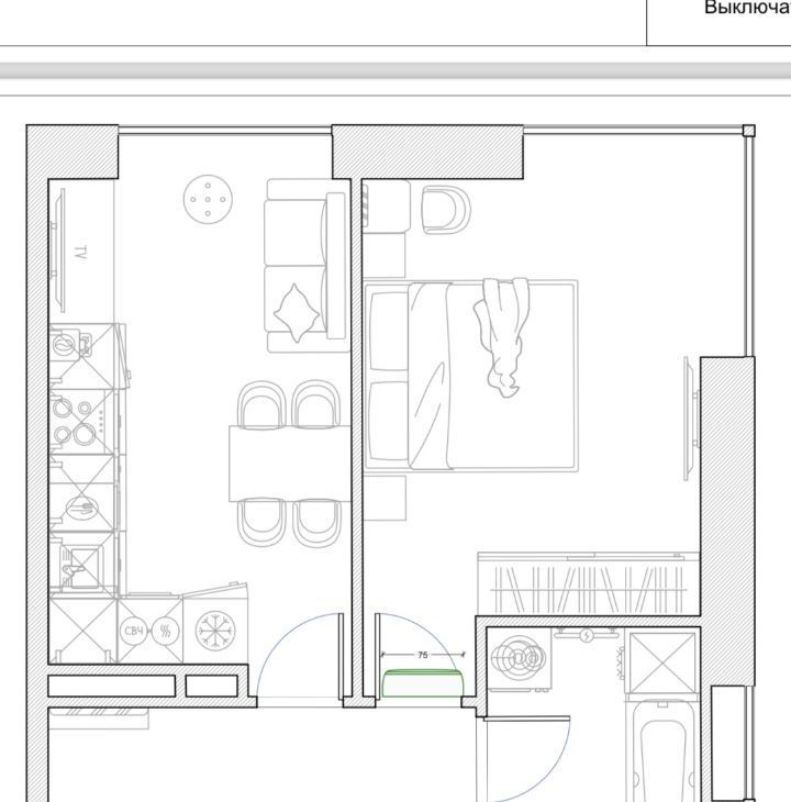 Удобная планировка с полноценной кухней-гостиной, просторной спальней, ванной комнатой удобного размера и большой прихожей.