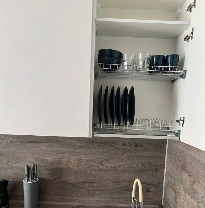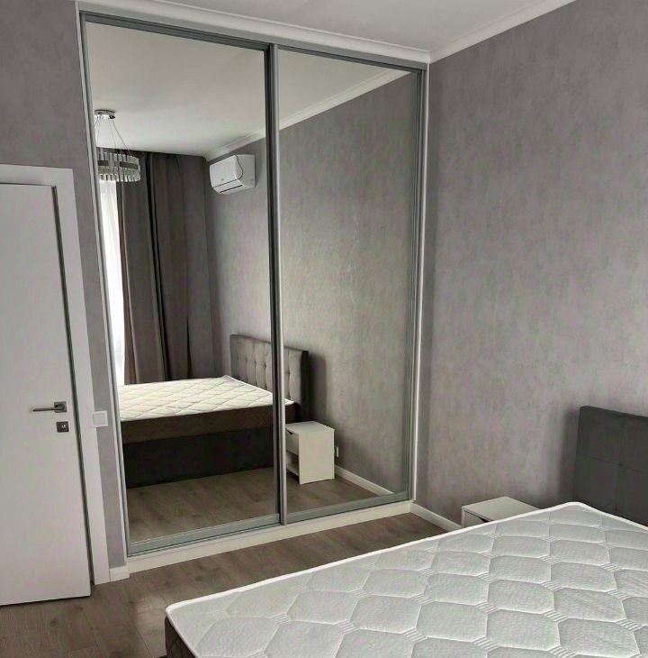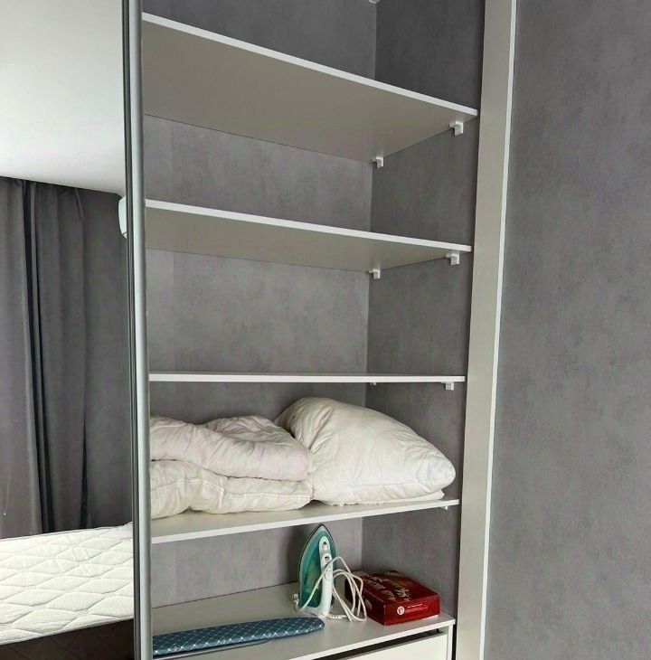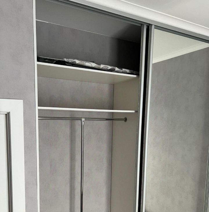Встроенные шкафы вдоль стены очень вместительные, что позволит разместить большое количество одежды и других личных вещей.