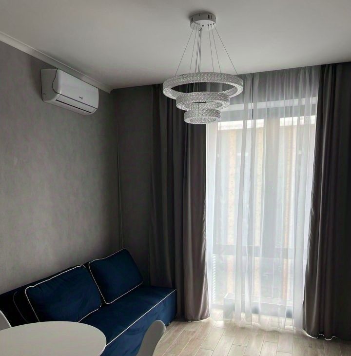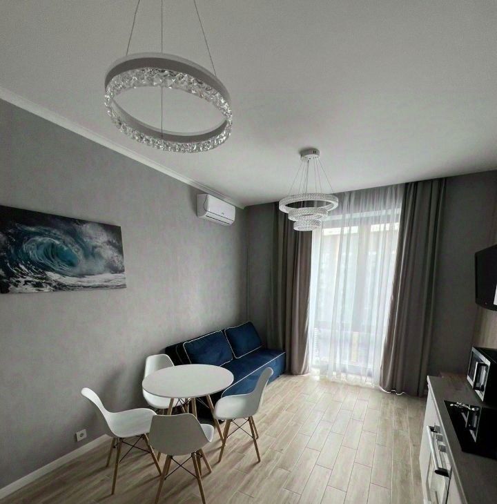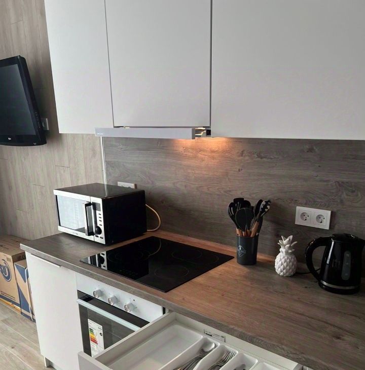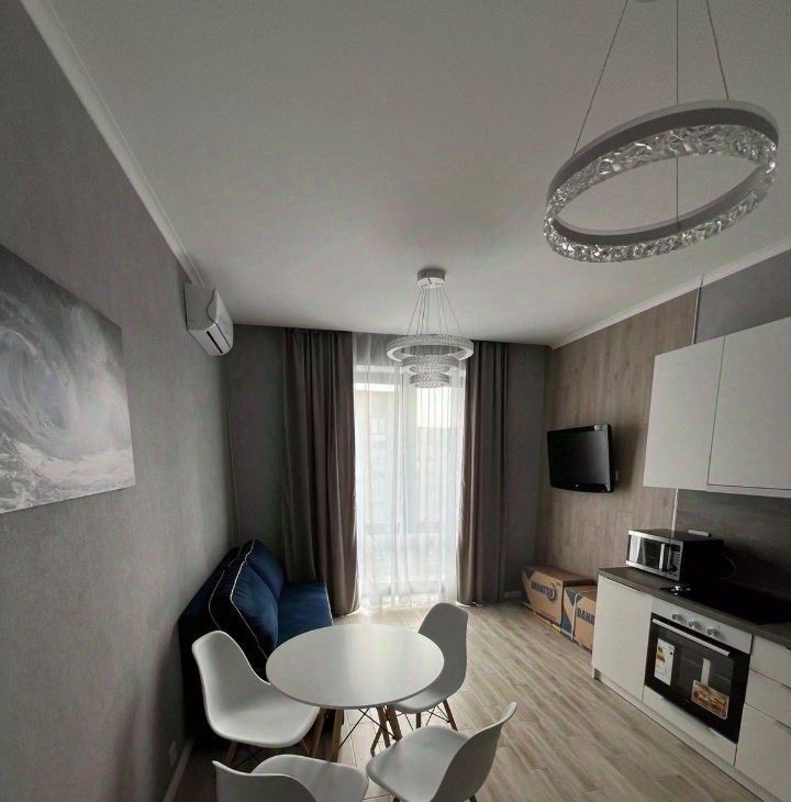 На кухне и в комнате установлена мебель, а также имеется вся необходимая техника: кондиционер, холодильник, посудомоечная машина, телевизор и стиральная машина.