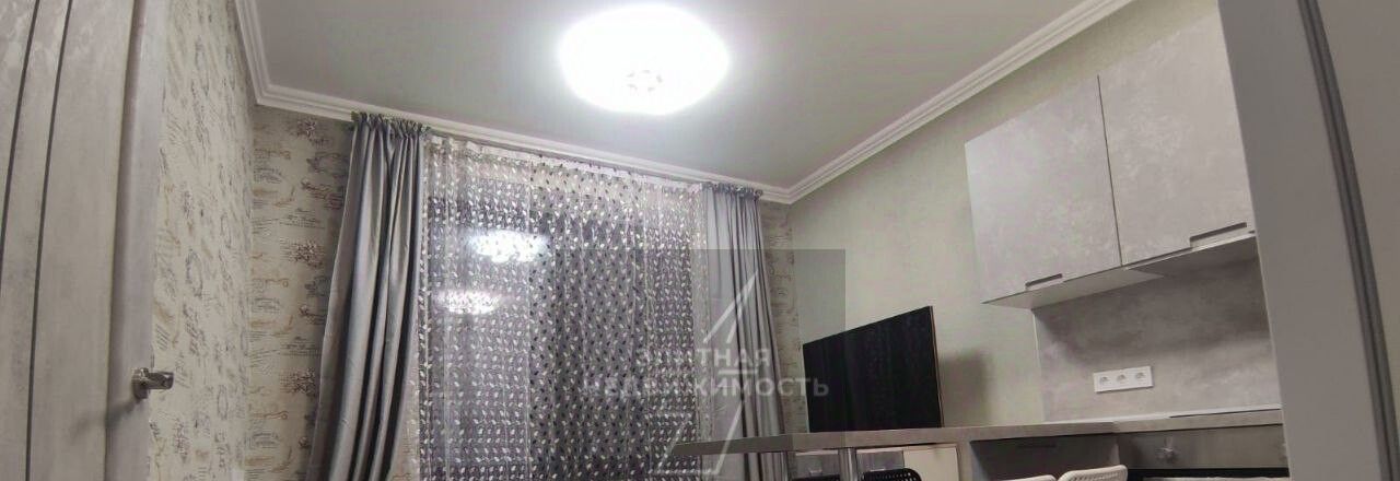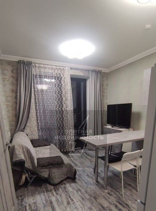Современная евродвушка расположена на 20 этаже в жилом комплексе Метрополия. Интерьер выполнен в светлых серых тонах с использованием качественных материалов и единого стиля во всех помещениях. Кухонная зона объединена с гостиной и оборудована встроенным духовым шкафом варочной панелью вытяжкой и холодильником Indesit. Функциональный кухонный гарнитур дополнен барной стойкой со стульями которая служит обеденной зоной. В зоне отдыха находится раскладной диван тумба с телевизором и выход на балкон с панорамным остеклением.