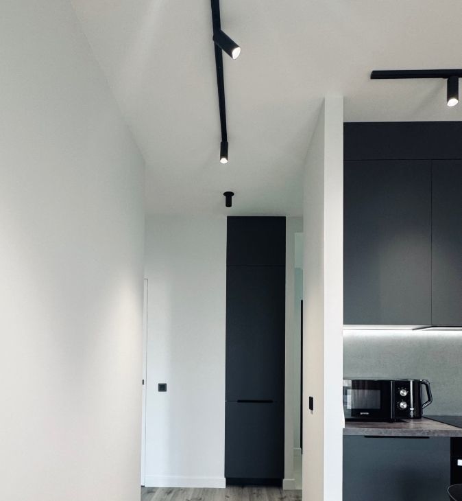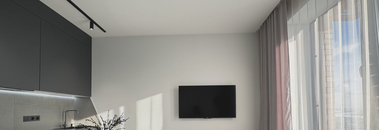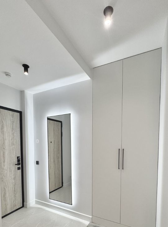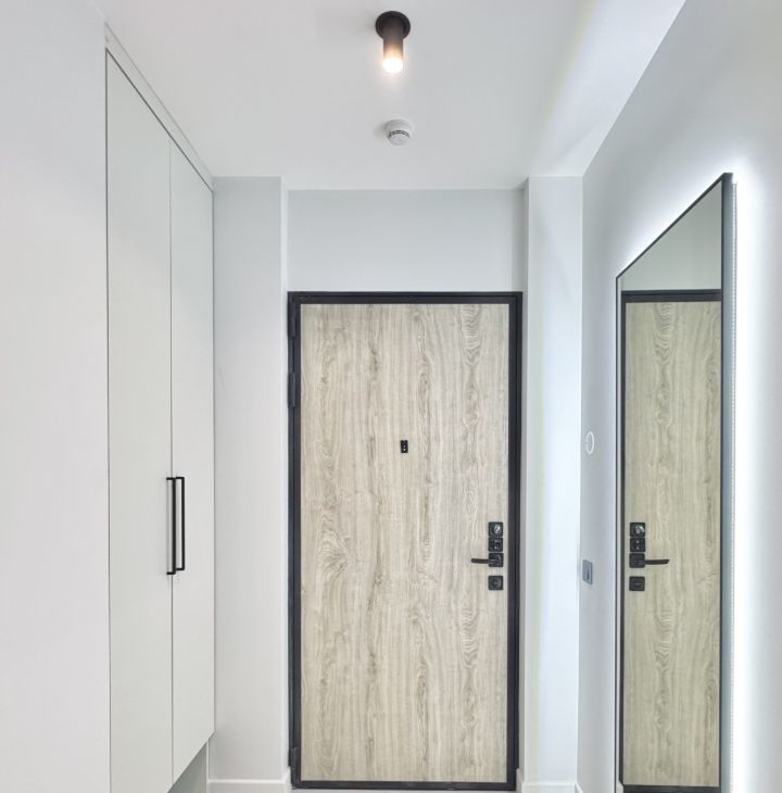 Светлая, лаконичная квартира с продуманной планировкой, отдельная зона кухни и гостиной, прихожая, спальня с рабочем местом.