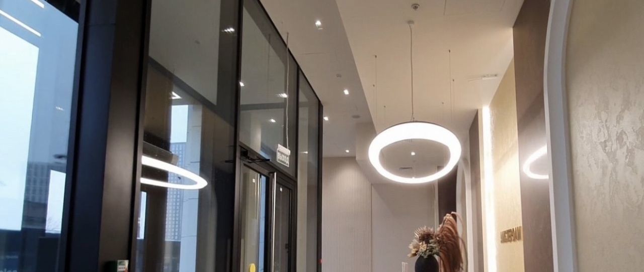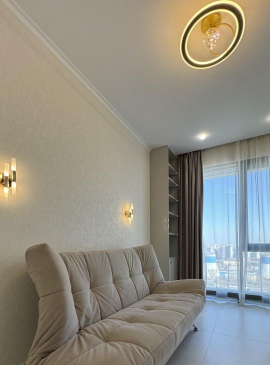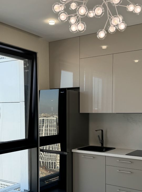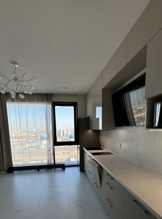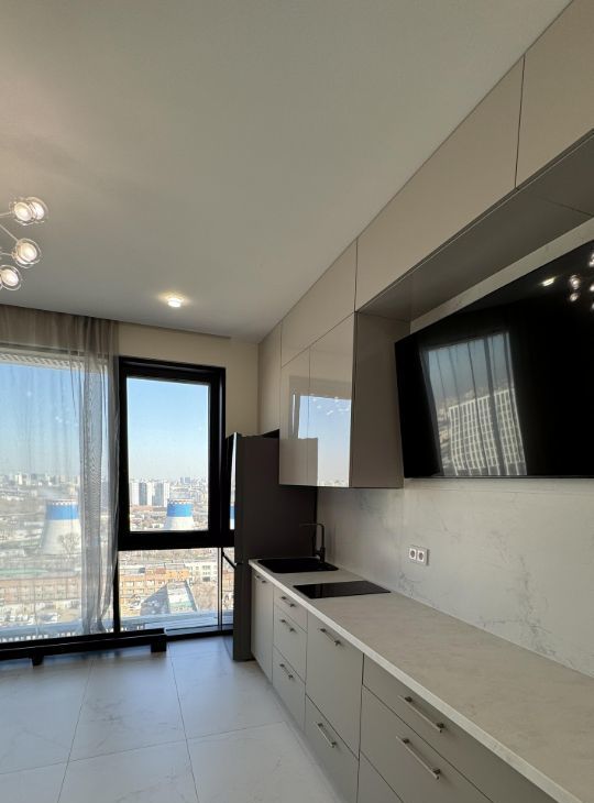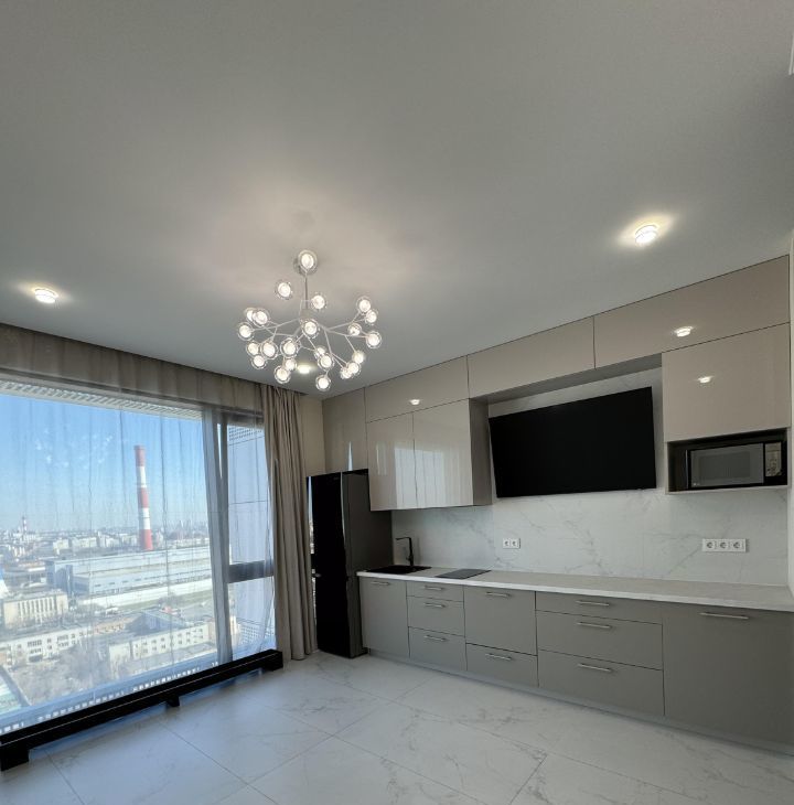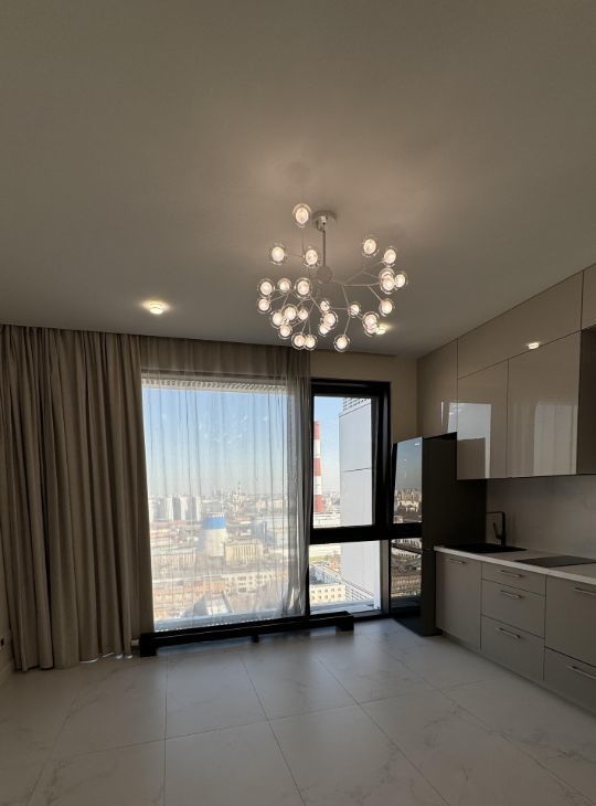 Квартира располагается в ЖК Метрополия, в белоснежном корпусе Амстердам, на 24-ом этаже, из окон которого открываются завораживающие виды на город и закаты.