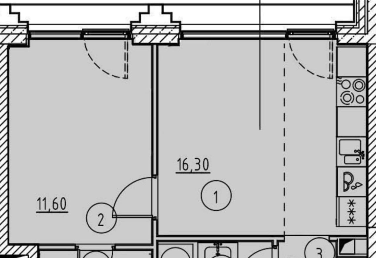 Квартира состоит из прихожей 2 м2 с большим встроенным шкафом, гостиной 16,3 м2 с большой кухней, ванной комнаты 4 м2, комнаты 12 м2 и гардеробной-кладовой 4 м2.