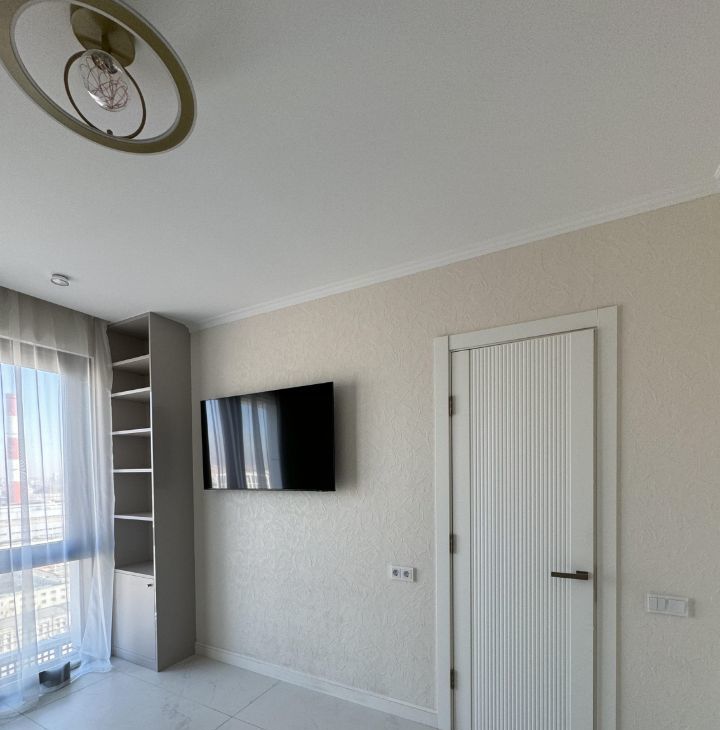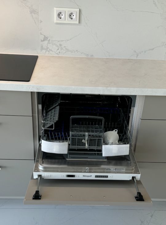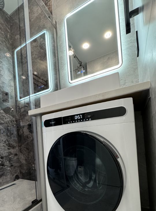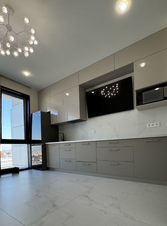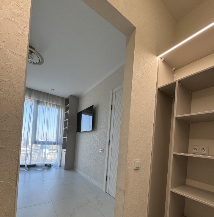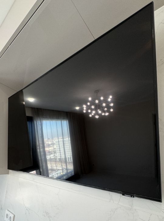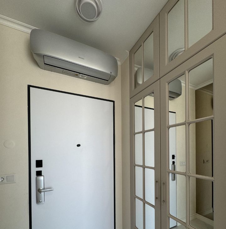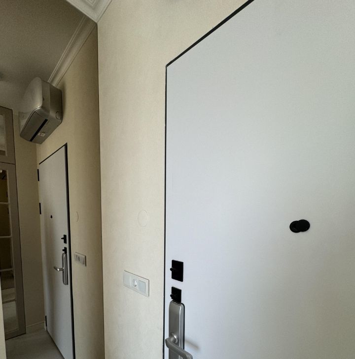 В квартире имеются: электронный замок на входной двери, работающий по брелкам, кодам и отпечатку пальцев, кондиционер, холодильник, 2 больших телевизора (в каждой комнате), посудомоечная машина, микроволновка, стиральная машина, теплые полы, проточный водонагреватель, аква-сторож,