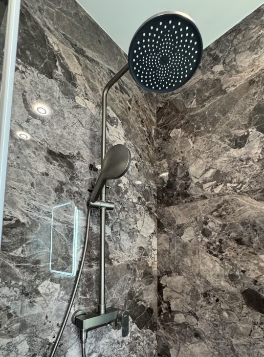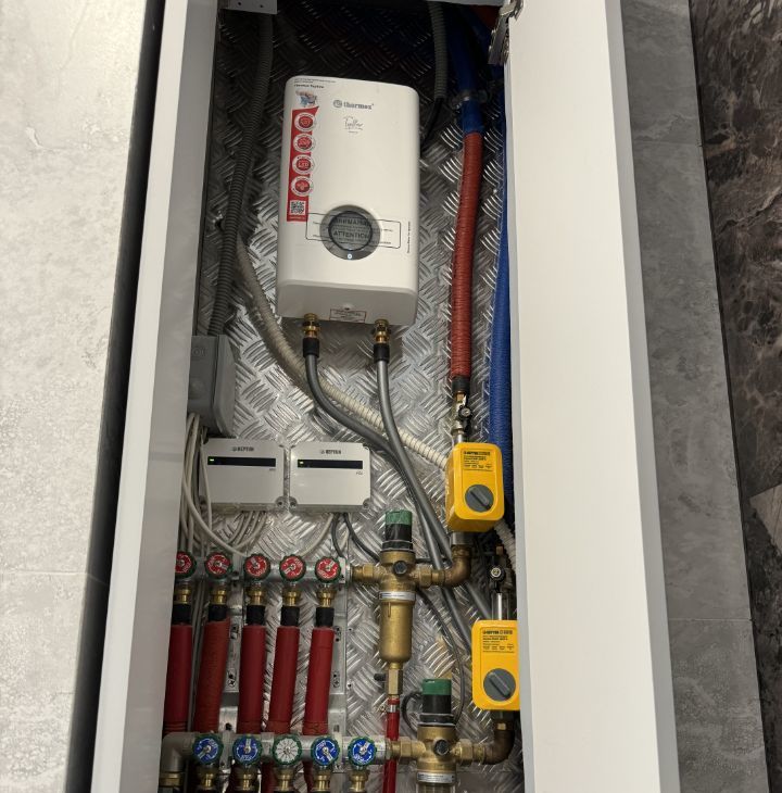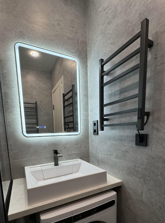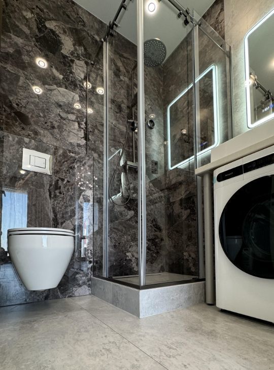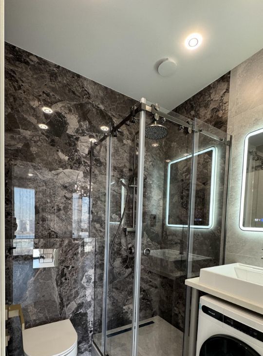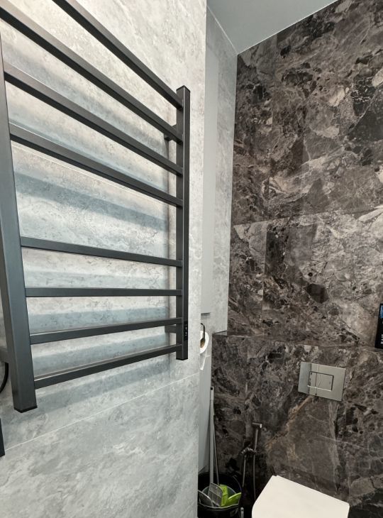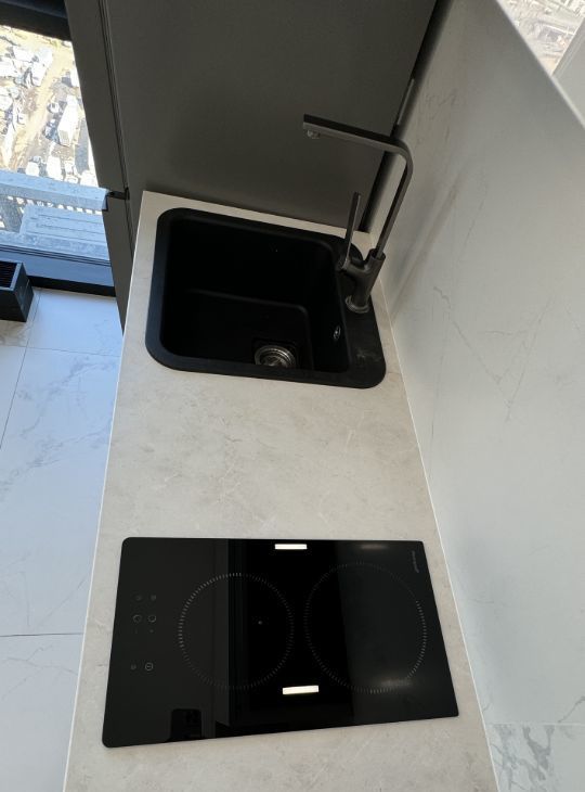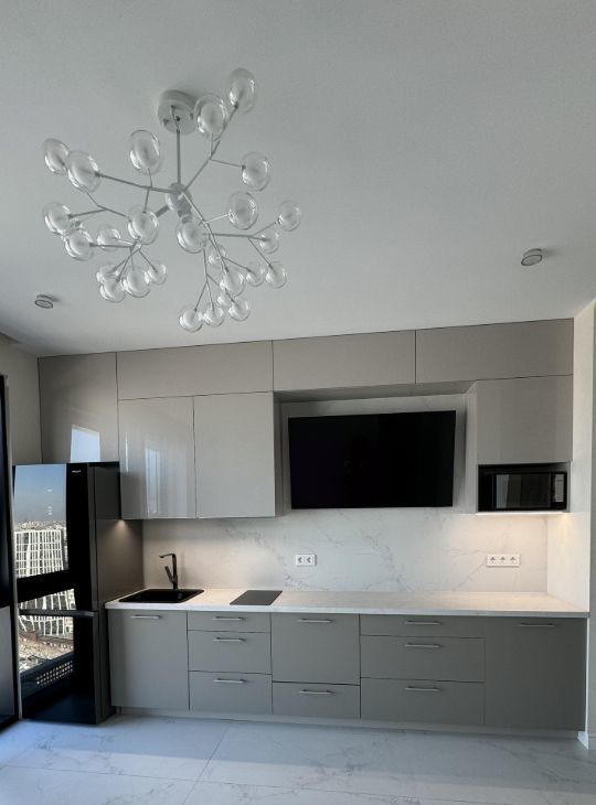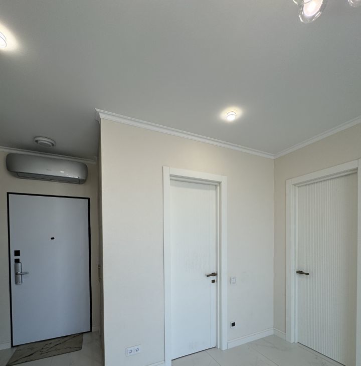 В квартире имеются: электронный замок на входной двери, работающий по брелкам, кодам и отпечатку пальцев, кондиционер, холодильник, 2 больших телевизора (в каждой комнате), посудомоечная машина, микроволновка, стиральная машина, теплые полы, проточный водонагреватель, аква-сторож,