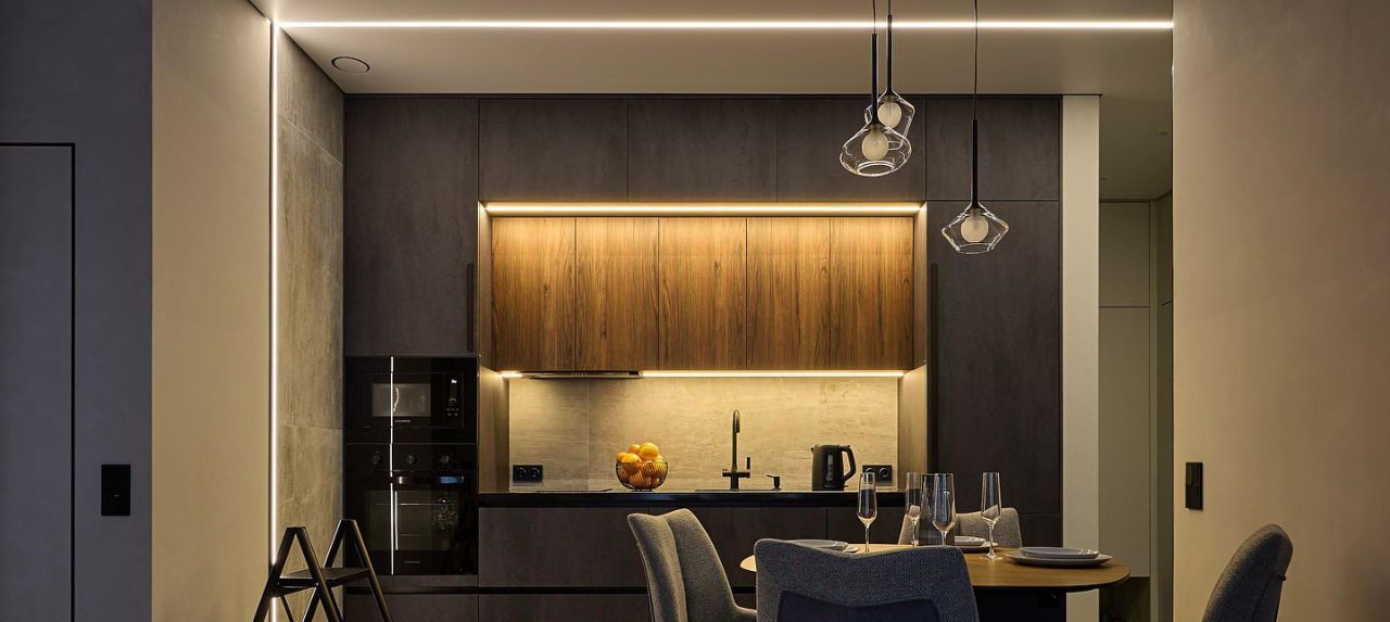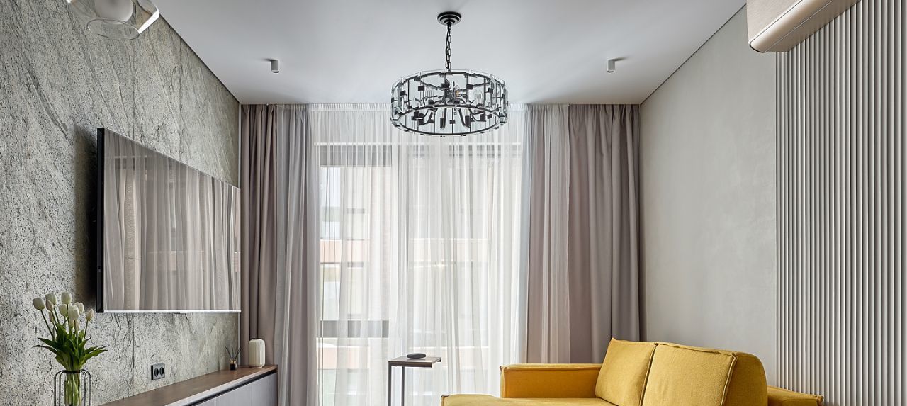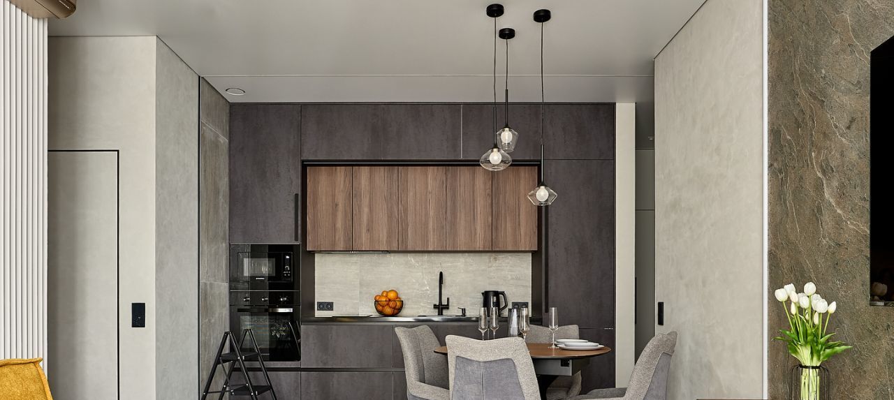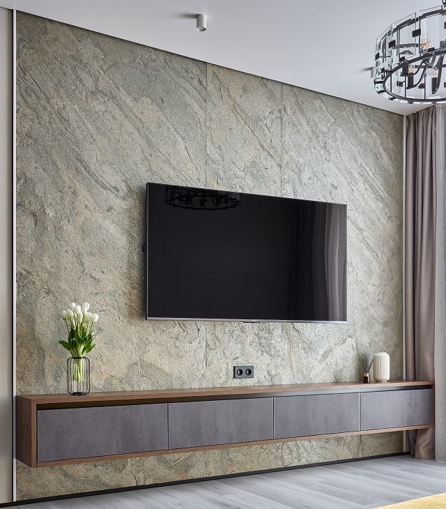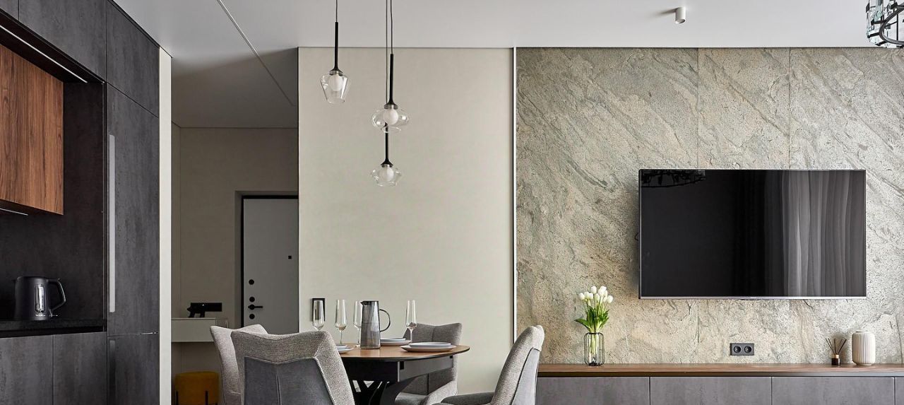 Интерьер выполнен в современном стиле, стены декорированы натуральным камнем, что создает атмосферу роскоши и уюта.