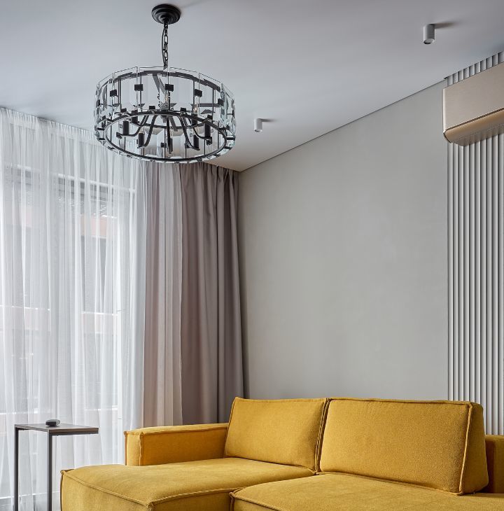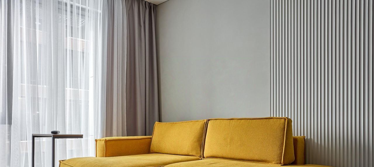 В гостиной удобный диван-кровать и огромный телевизор SMART диагональю 65 дюймов.