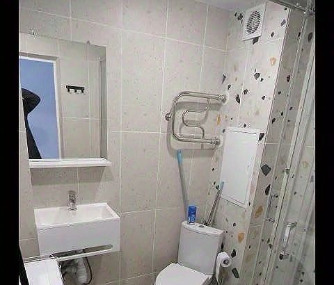 Кухня площадью 5 м² оборудована современной техникой, включая холодильник и микроволновую печь. Санузел оснащен душевой кабиной и стиральной машиной