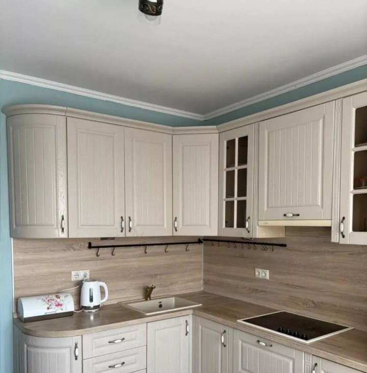 Кухонный гарнитур со встроенной техникой ( духовой шкаф, электрическая варочная панель, свч, холодильник) обеденный стол со стульями