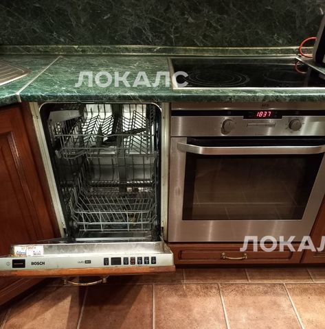 Кухонный гарнитур натуральное дерево со встроенной бытовой техникой и посудомоечной машиной Бош.