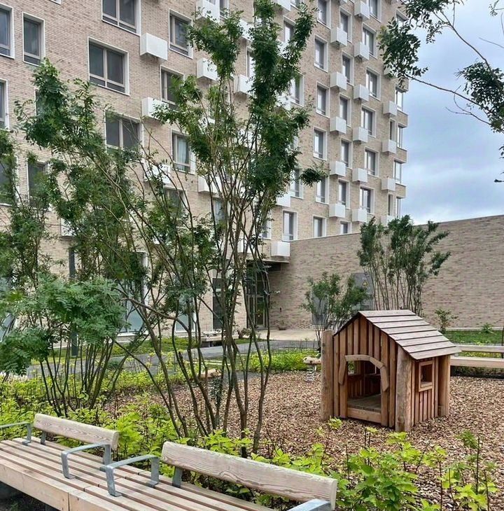 Красивый двор-парк без машин, непосредственно в доме есть кафе, пиццерия, Озон, Яндекс, WВ, супермаркеты ВкусВилл, Пятерочка, Магнит