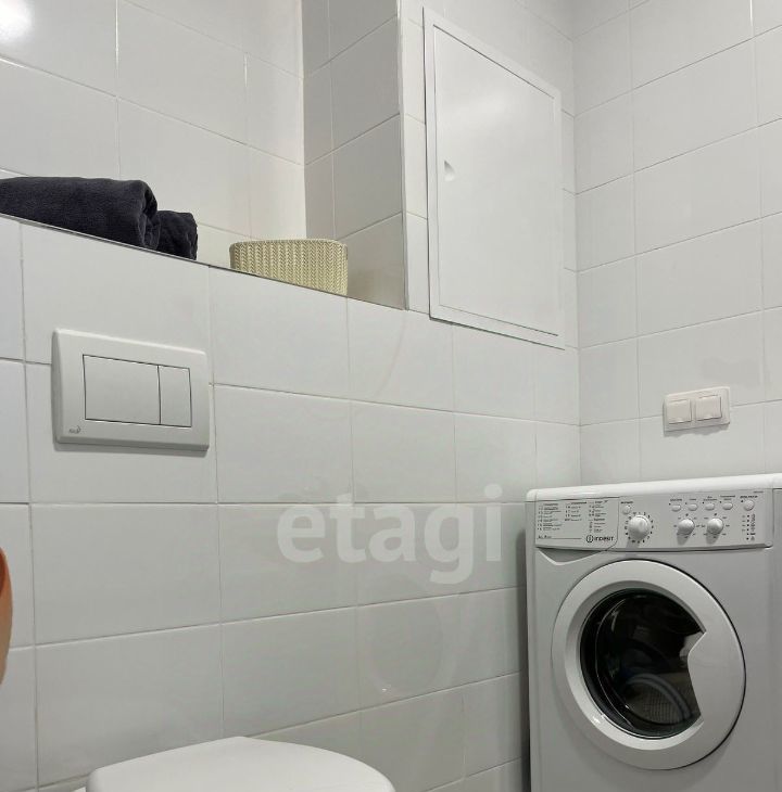 Большая прихожая 8 кв. метров, с гостевой ванной комнатой, в которой установлена стиральная машина.
