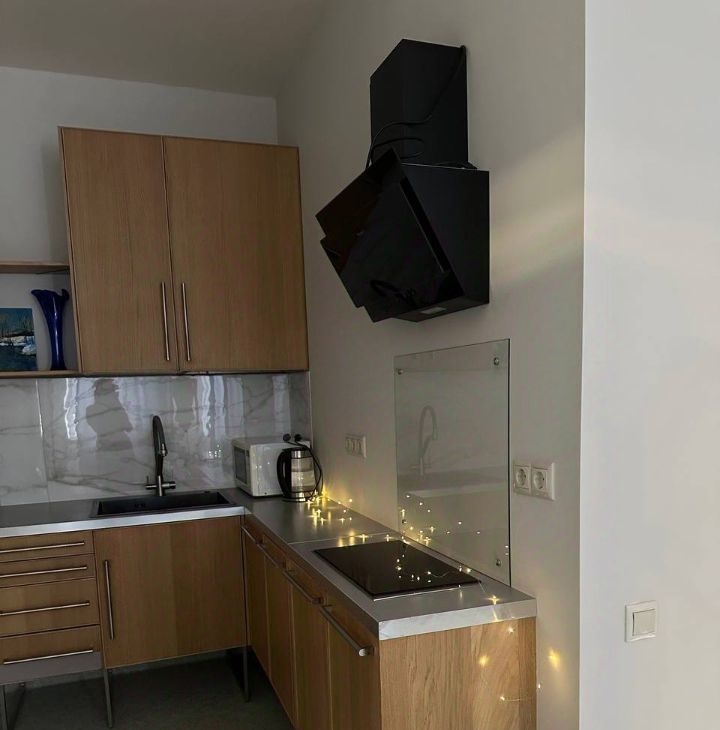Кухня оснащена холодильником, морозильником, стеклокерамической панелью, духовым шкафом, микроволновой и чайником. Здесь установлен про точный фильтр для воды.