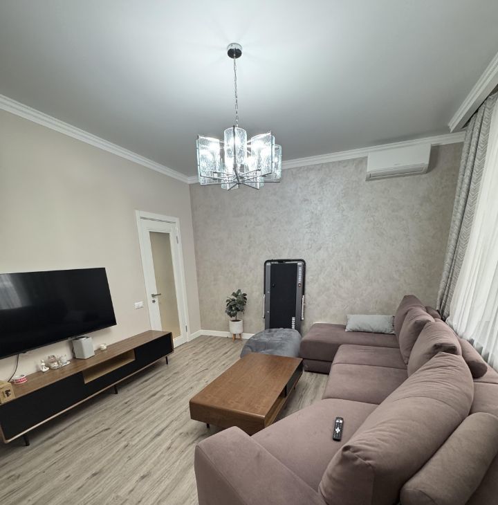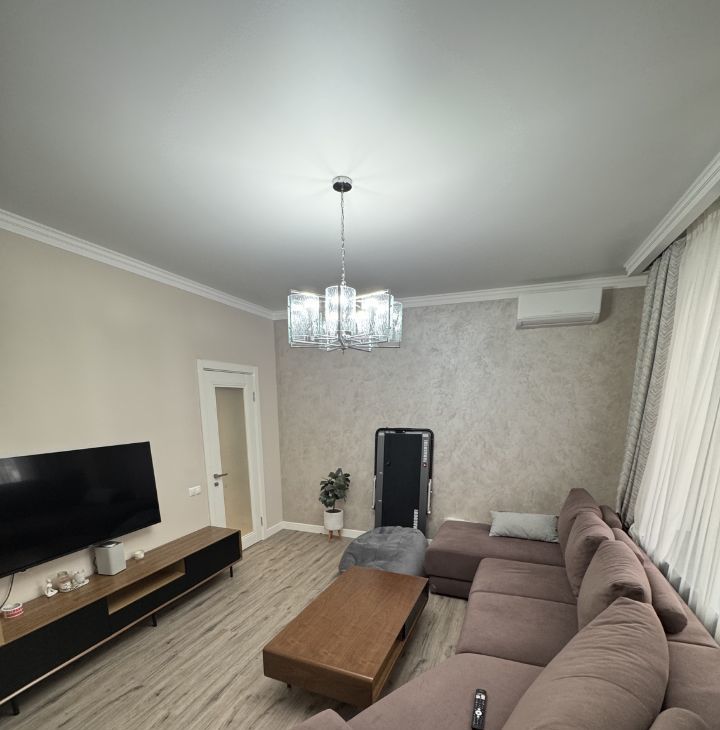 Сдается в аренду уютная двухкомнатная квартира с дизайнерским ремонтом, расположенная в современном жилом комплексе. Общая площадь составляет 78 кв.м, жилая — 46 кв.м, кухня — просторные 14 кв.м. Квартира находится на 10-м этаже кирпичного дома, построенного в 2020 году, с высокими потолками 3.1 метра. Из окон открывается вид на улицу. До станции метро "Спартак" всего 6 минут пешком.