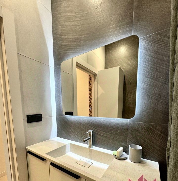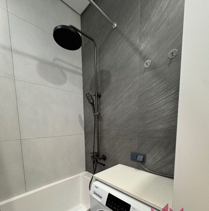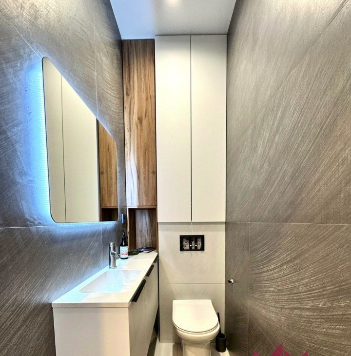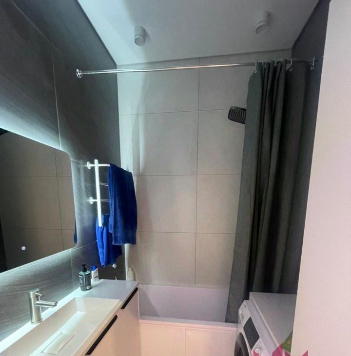 Совмещенный санузел с душевой кабиной, гостевой туалет, есть стиральная машина, полотенцесушитель, зеркало с подсветкой.