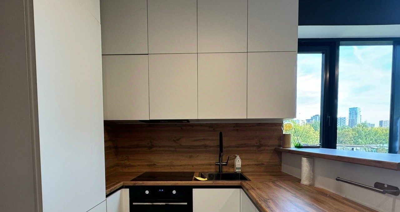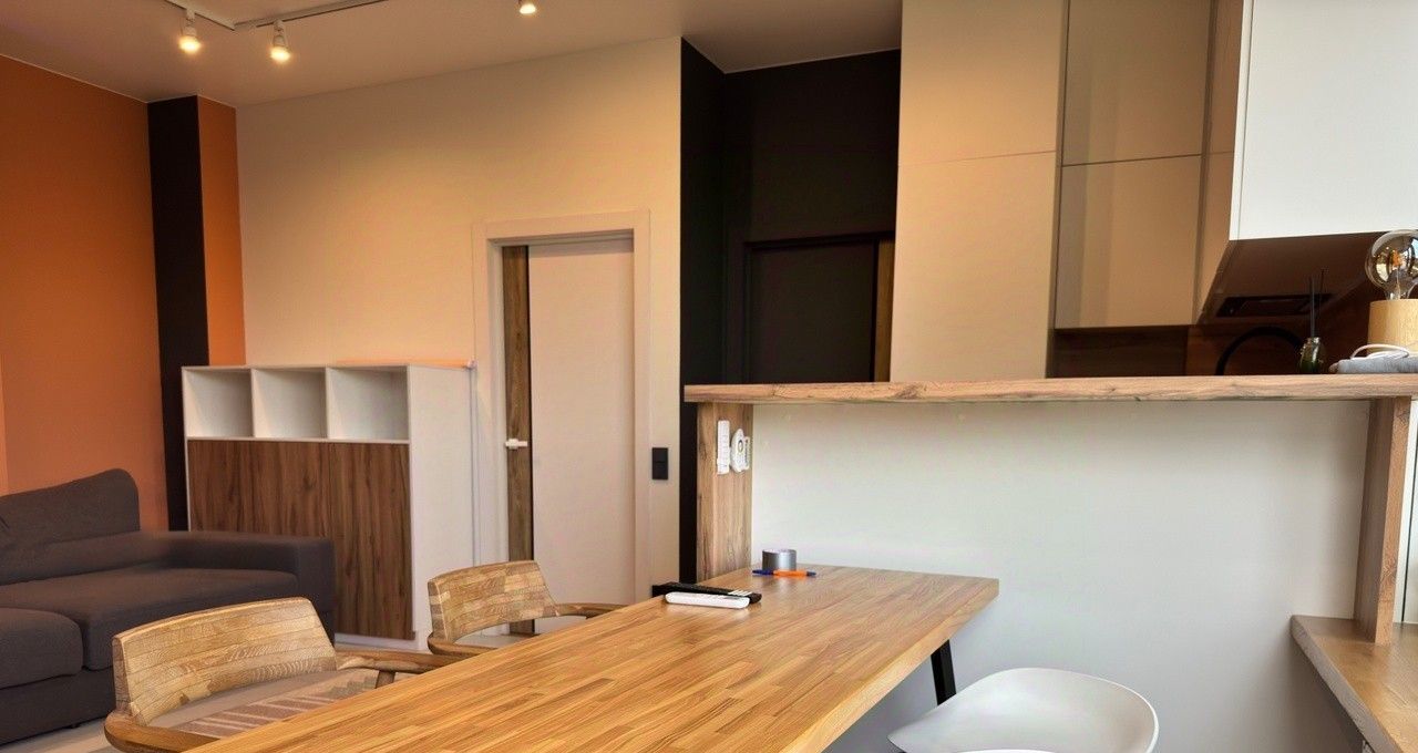 Кухонная зона оборудована всей необходимой техникой: вытяжка, индукционная плита, холодильник, духовой шкаф, микроволновая печь, посудомоечная машина, вместительный шкафчики.