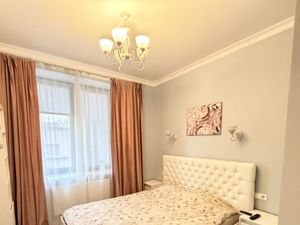 Квартира выполнена в дизайнерском стиле и полностью готова для комфортного проживания. Здесь есть вся необходимая мебель как в комнатах,(спальня и другая комната изолированы),так и на кухне-гостиной. Из техники в вашем распоряжении: кондиционер, холодильник, телевизор и стиральная машина. В ванной комнате установлена современная душевая кабина. Отдельная комната для стирки. Гардеробная для хранения вещей. Высокие потолки в 3,2 метра создают ощущение простора и света.