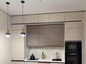 Дорогая кухня укомплектована встраиваемой бытовой техникой: посудомоечная машина, духовой шкаф, большой холодильник, варочная панель, вытяжка, микроволновая печь, чайник.