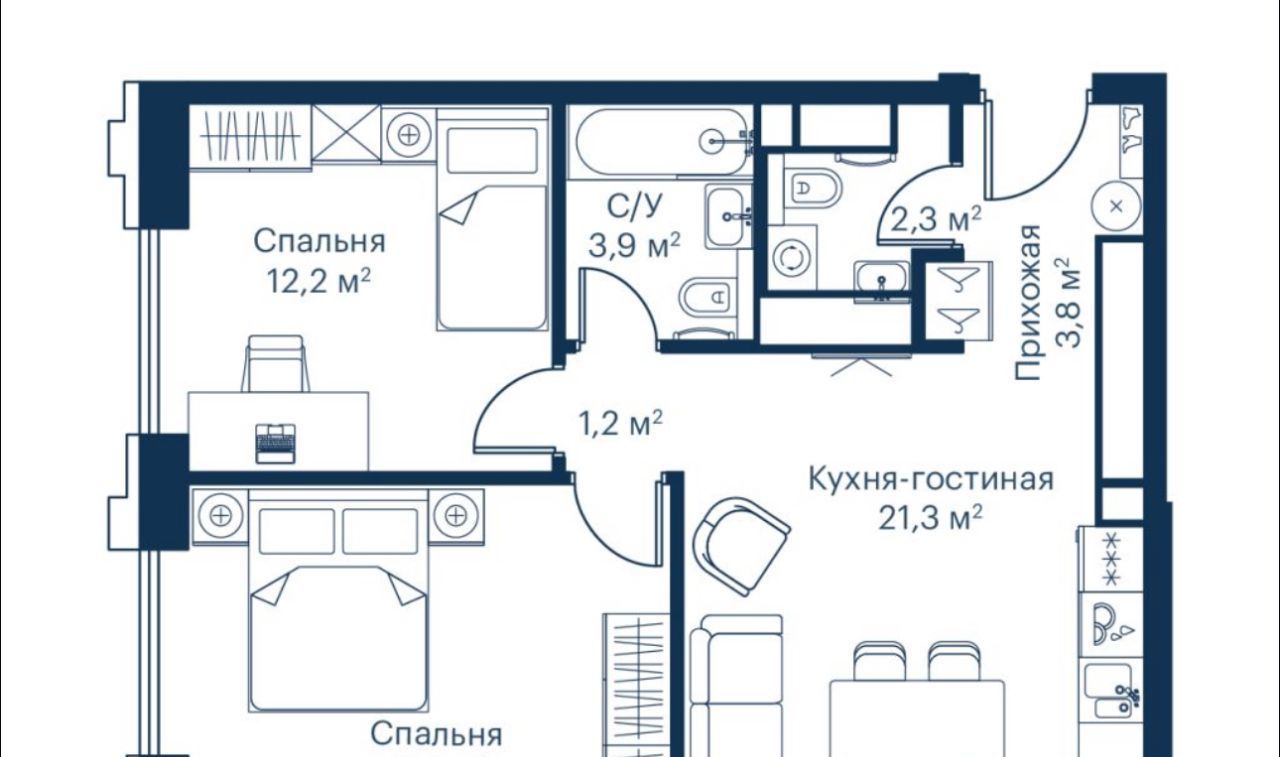 2-е просторные спальни: 17м2 и 12 м2, с видом во двор в сторону запада;