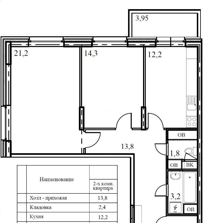 Большая угловая гостиная с 2 окнами, 21,3 кв.м., спальня 14 кв.м., кухня 12 кв.м., оборудованная всем необходимым. Из кухни есть выход на застекленную лоджию. При входе в квартиру есть вместительная гардеробная.
