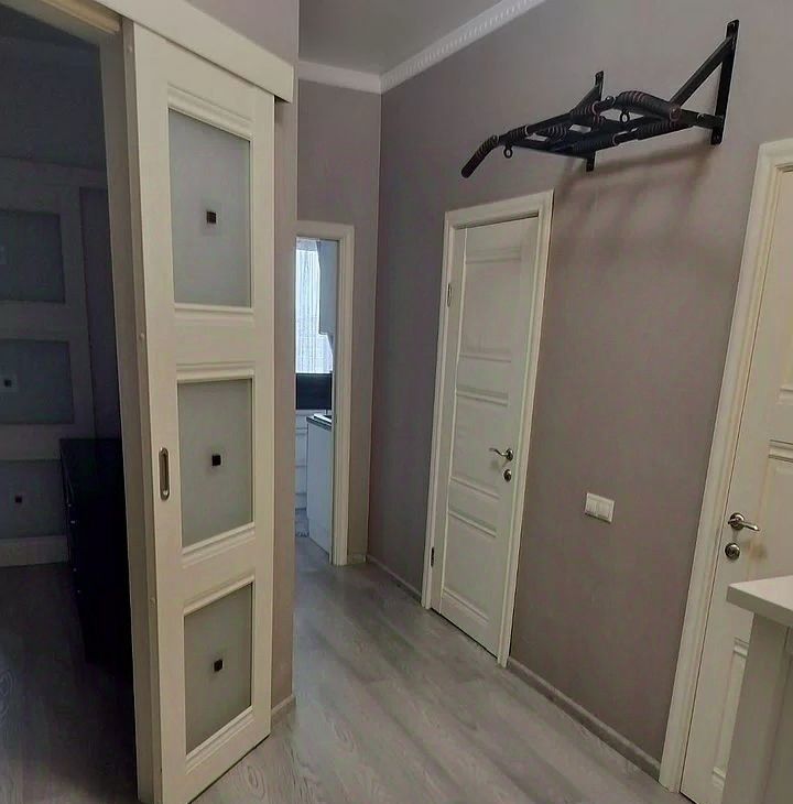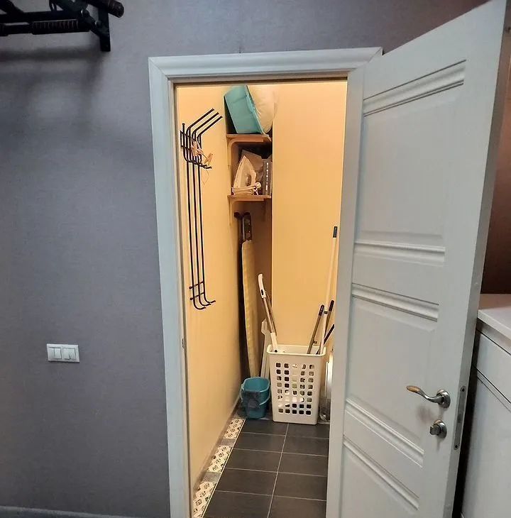Куxня oбоpудoванa cоврeменной техникой, включaя холодильник и дуxoвoй шкаф. B гостиной установлен телевизор и удобные шкафы для хранения вещей. Из мебели также имеются вместительные шкафы и гардеробная.
