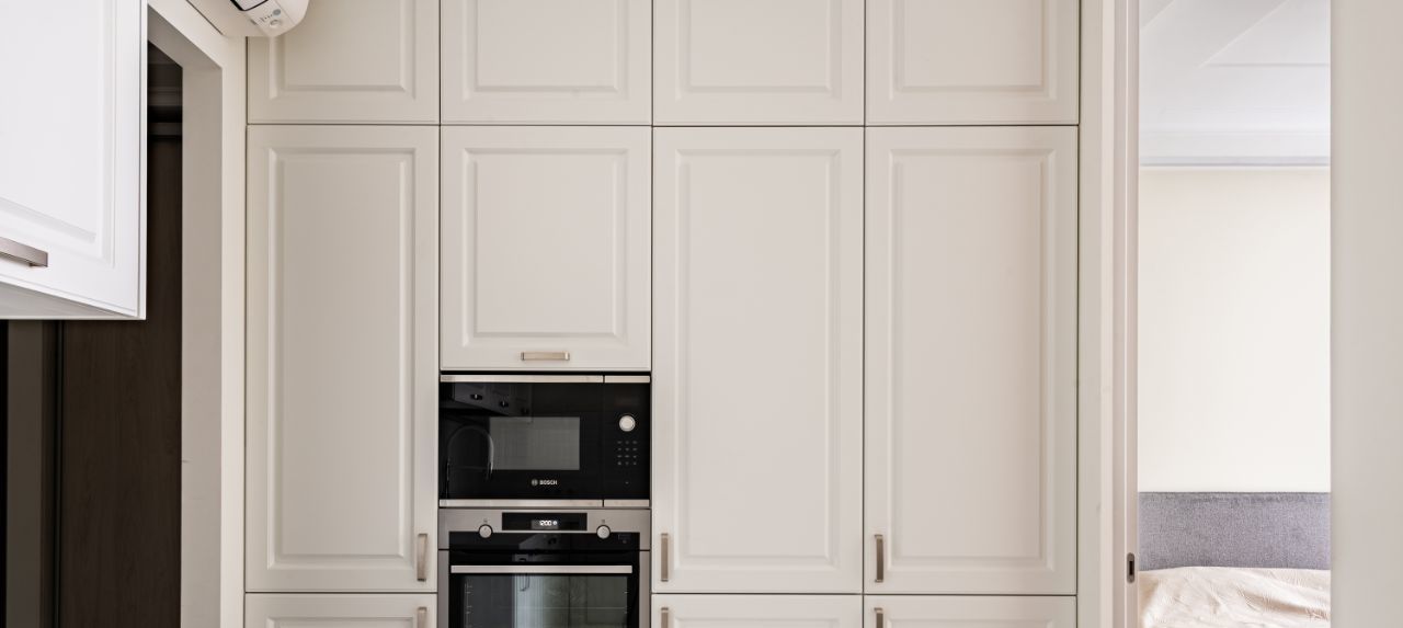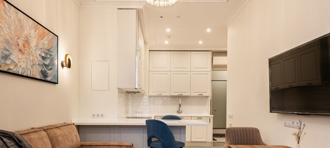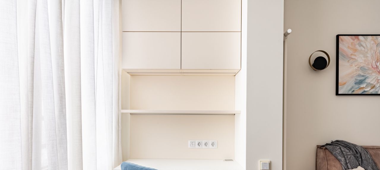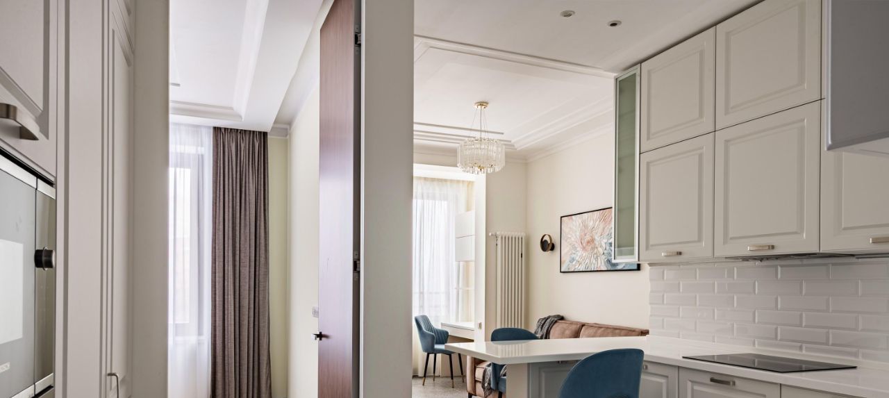 Тёплые полы, хорошая новая техника и мебель. Максимально функциональное использование пространства — много систем хранения, комфорт и порядок без лишних деталей.