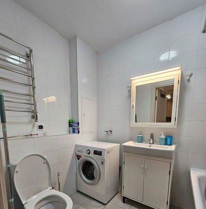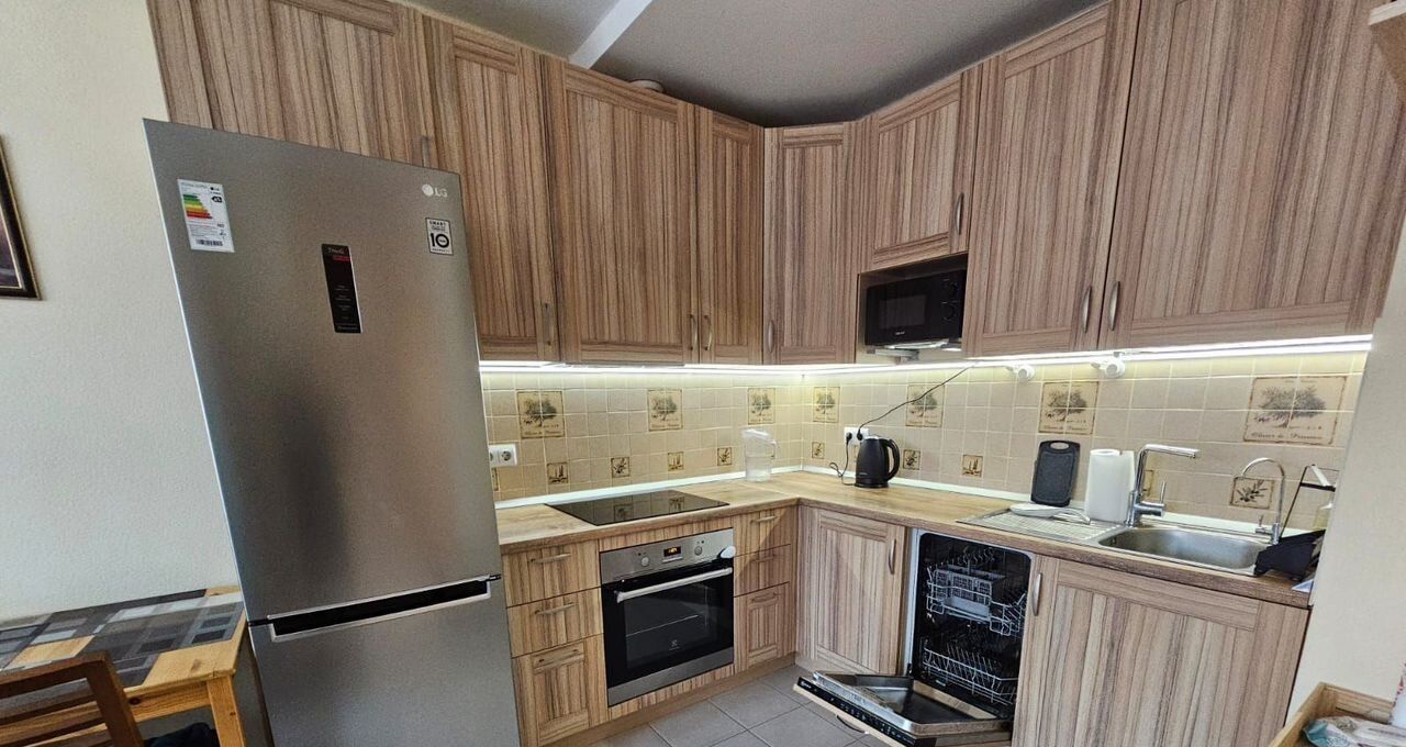 В квартире есть все необходимое для проживания. Здесь большая современная просторная кухня с огромными шкафами и техникой ведущих брендов: индукционная варочная панель, посудомоечная машина, духовка, СВЧ-печь, холодильник. В квартире также имеется стиральная машина, телевизор, кондиционер.