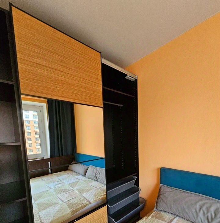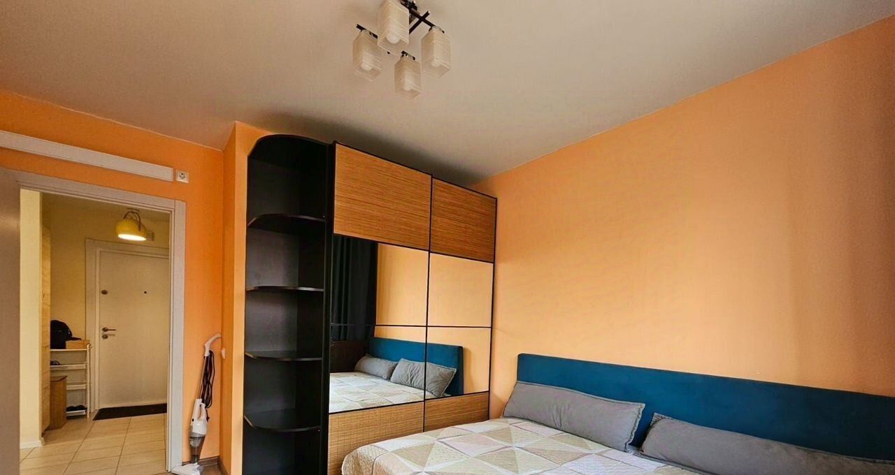 В квартире есть изолированная спальня с двуспальной кроватью и большим вместительным шкафом-купе.