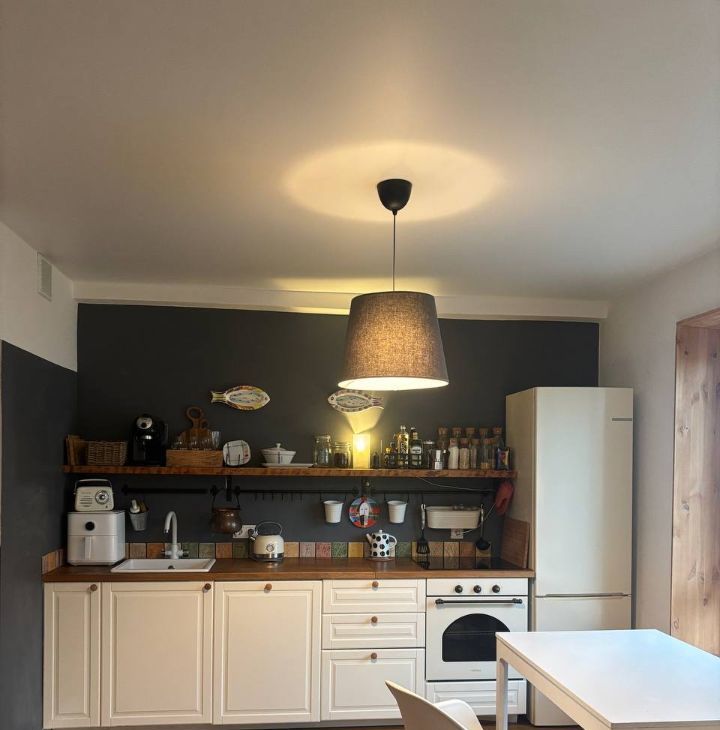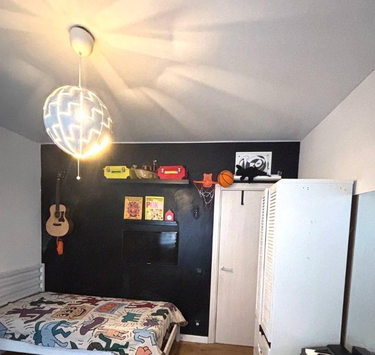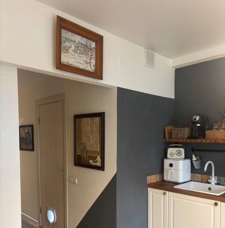 Часть стен окрашена, часть оклеена обоями под покраску. Потолки натяжные.