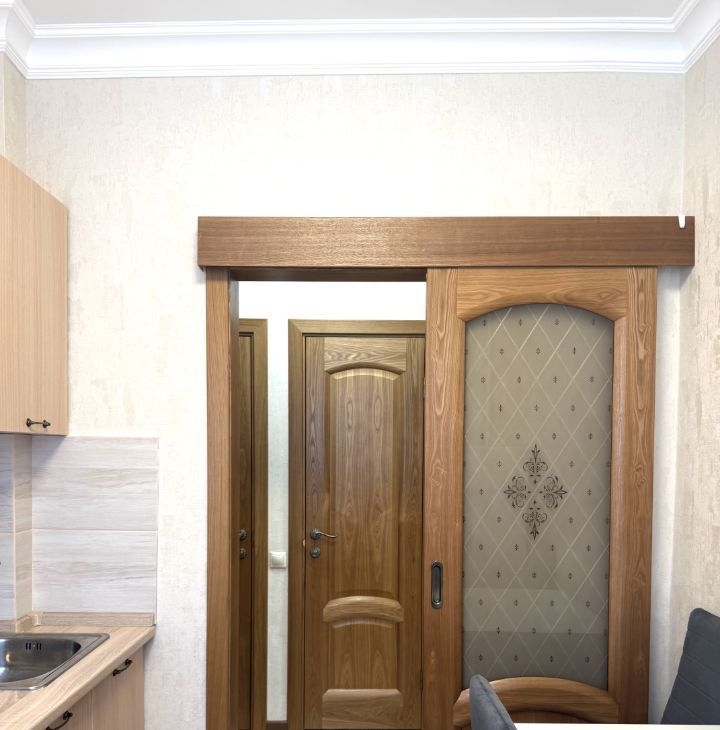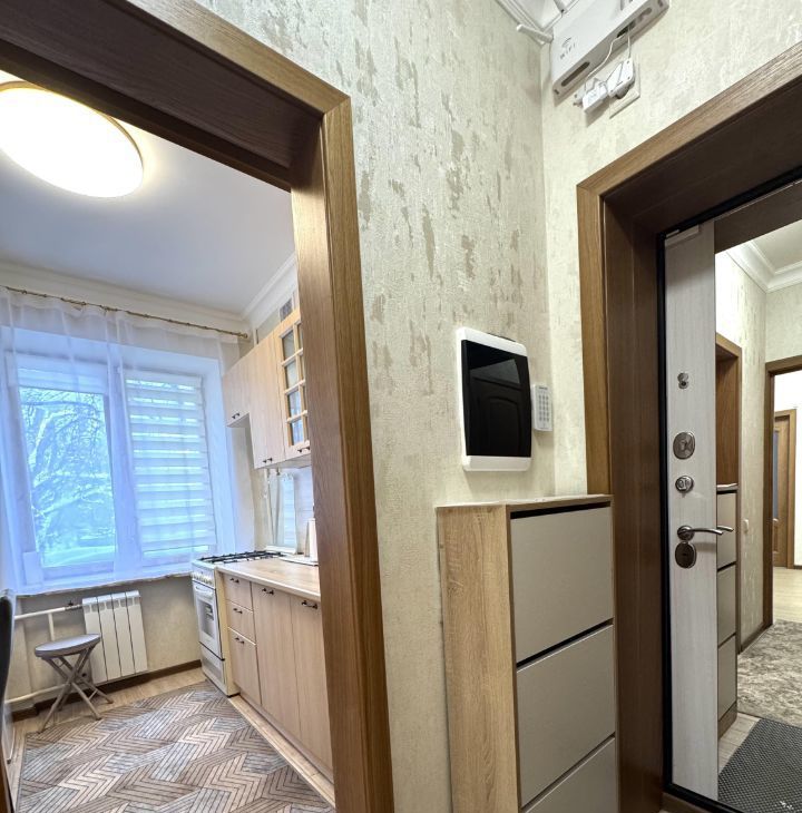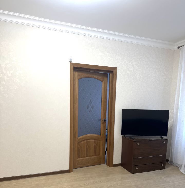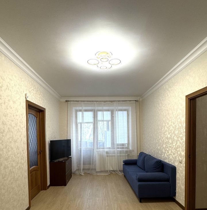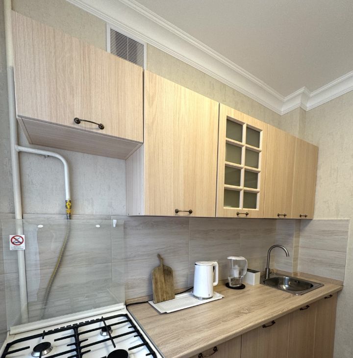 Квартира состоит из изолированной кухни с газовой плитой и необходимой бытовой техникой. Просторной комнаты с раскладным диваном и большой новой кроватью ( на фото нет, так как еще не доставили) , комод с ТВ и выход на балкон.