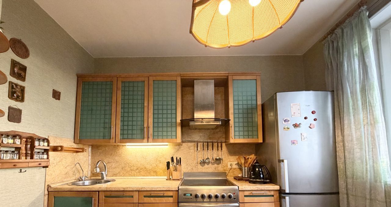 Кухня 9 кв м: встроенный кухонный гарнитур с бытовой техникой: электроплита с духовкой ARDO, вытяжка Elikor, холодильник Atlant, микроволновка BBК, чайник, ТВ LG, обед расклад стол, уголок, 4 стула.