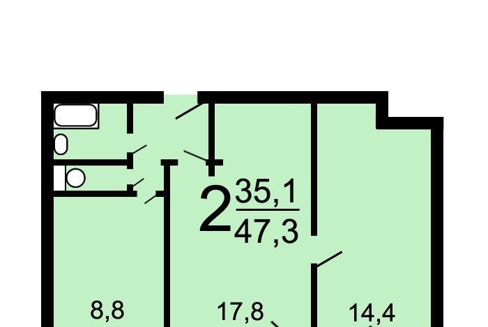 Площадь: 48 м² | 2 комнаты (проходная планировка)