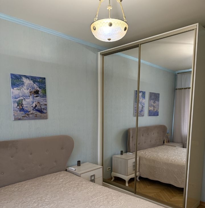 Комнаты раздельные. В спальне есть двуспальная кровать, тумбочки, вместительный встроенный шкаф, телевизор.